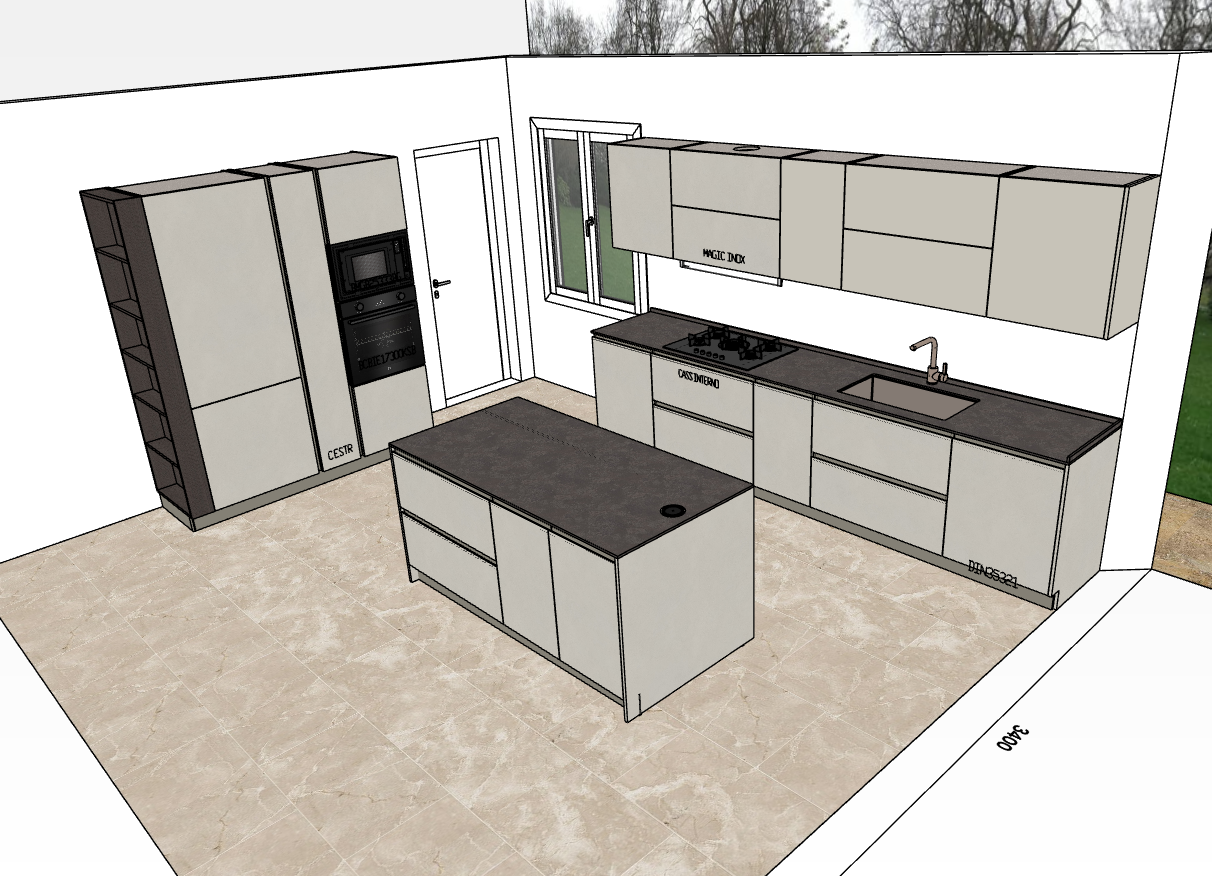 contemporary kitchen design featuring sleek cabinetry in light beige with matte finish countertops in dark charcoal gray with subtle texture floor tiles in warm muted beige with marble pattern crisp white walls for modern ambiance large window allowing natural light creating a cozy yet sophisticated atmosphere luminous morning sunlight casting soft shadows creating a harmonious balance between elegance and comfort