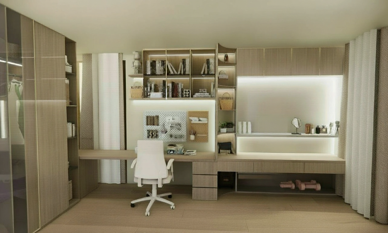 it is a modern office with a white library and wall at the right it has a white desk at front and next a white meeting table with white chairs at the back there is a tv furniture also white