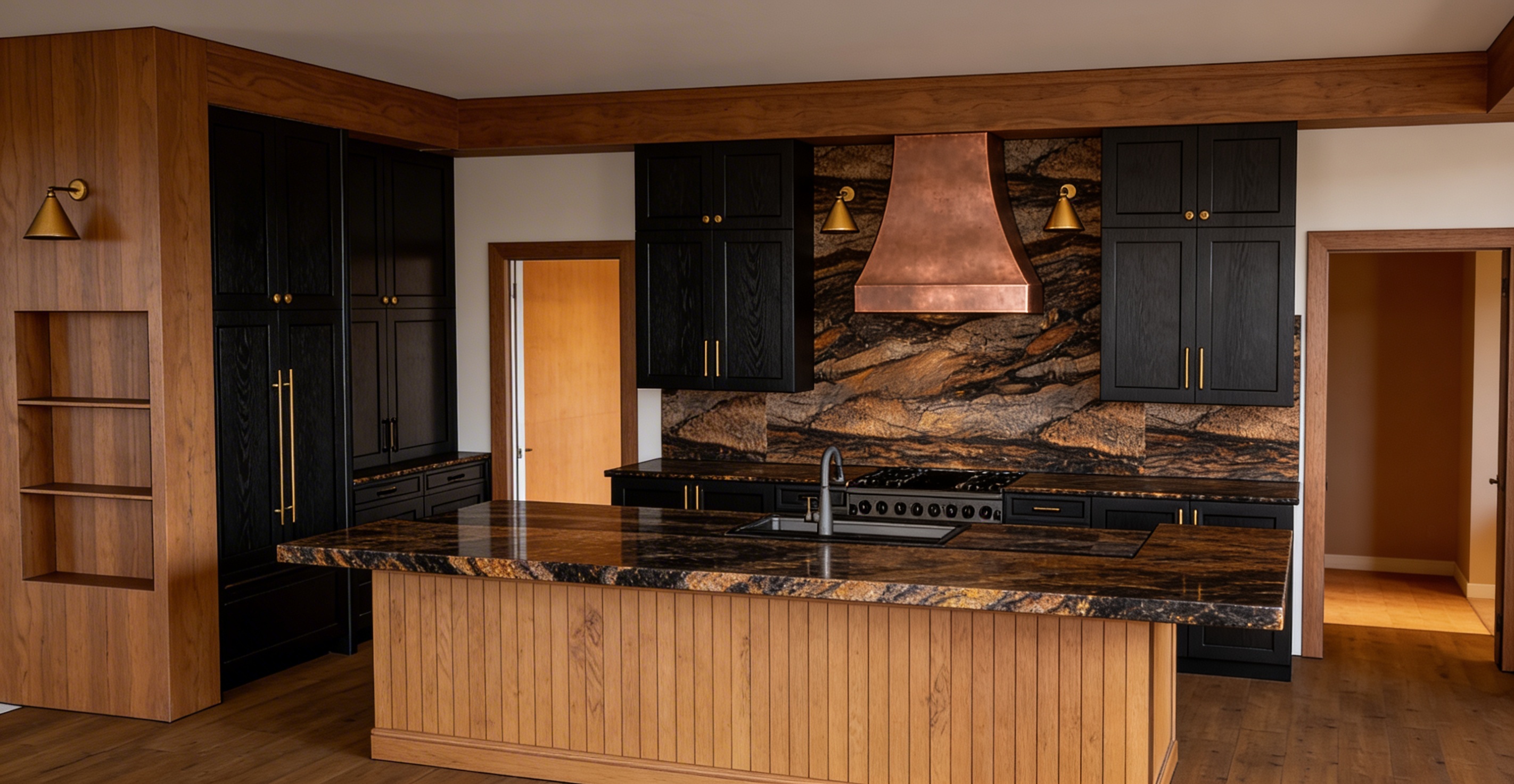 scene preservation critical use the provided sketchup model exactly as is do not redesign simplify or reinterpret geometry maintain all cabinet layouts proportions door styles trim backsplash hood shape and island structure exactly as shown strict material assignment do not override geometry vertical surfaces all cabinetry perimeter cabinets deep black stained wood with visible grain not painted not flat black island base medium caramel wood tone with natural grain and warmth tall paneling trim match island wood tone horizontal surfaces only countertops apply polished exotic granite titanium gold style only to countertop surfaces do not apply granite to island sides cabinet faces or any vertical surfaces important rule stone granite horizontal planes only wood vertical cabinetry only countertop description apply only to tops polished exotic granite with dramatic horizontal flowing veins deep charcoal black warm brown bronze and gold tones organic layered movement with high contrast medium to large scale veining subtle polished finish not overly glossy natural stone variation with fine mineral detail hood fixtures range hood brushed copper with soft natural patina keep exact shape hardware warm brass tones maintain placement doorways important fix both side doorways must open into real interior rooms not blank space use warm cohesive tones wood taupe soft browns no bright white or exterior light slightly dimmer lighting than kitchen lighting fixes your current flat look overall brighter warm natural interior lighting sconces must cast visible downward light onto backsplash add soft under cabinet glow preserve warmth do not wash out materials preserve these exactly backsplash pattern and color flooring tone and direction cabinet layout and spacing island proportions and overhang all trim architectural details do not turn island into stone do not remove wood grain do not flatten cabinet color to pure black do not crop cabinetry do not overexpose lighting do not simplify or change any materials the island coutertop will remain a thick wood and where the sink is it will be that granite