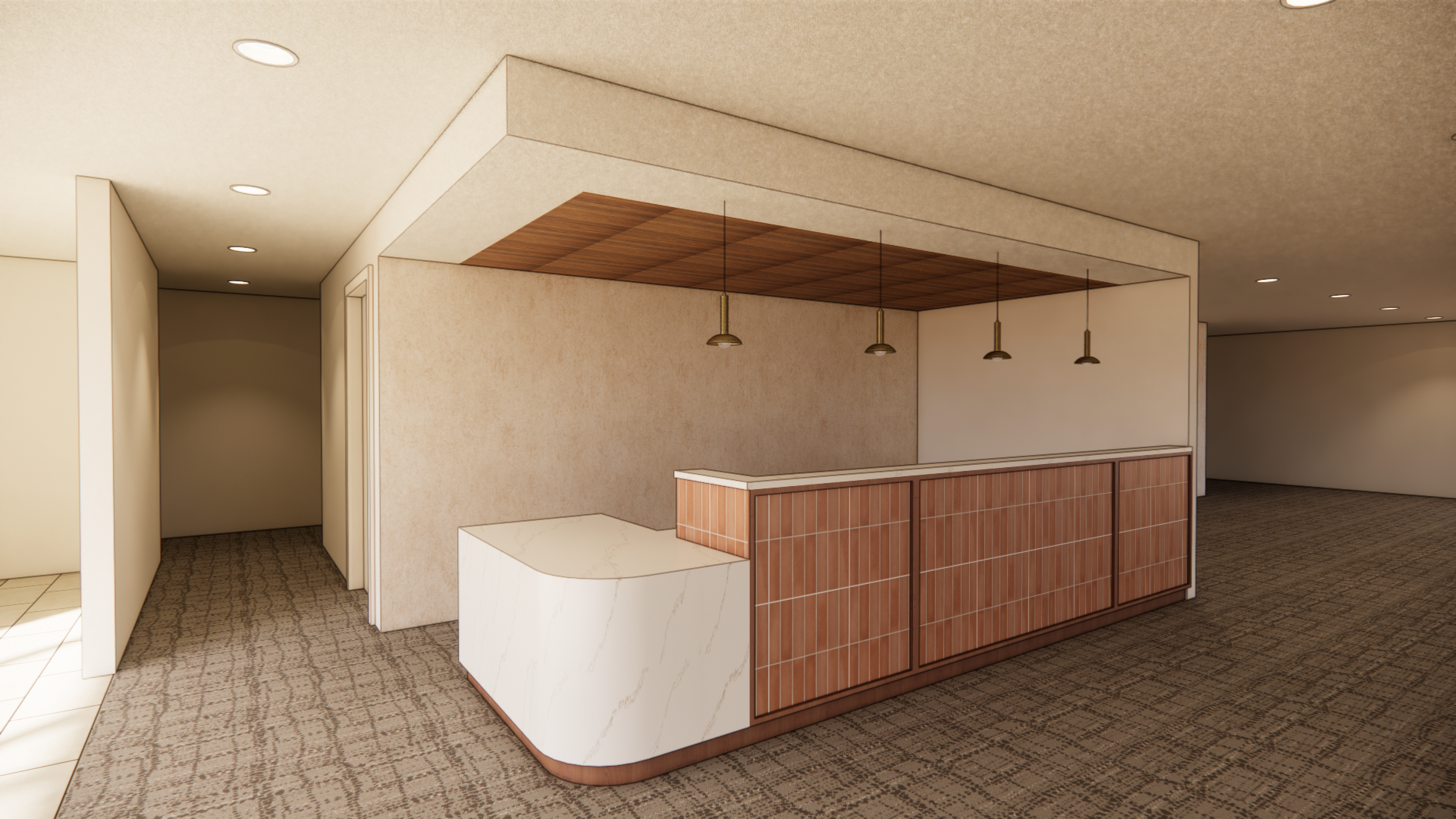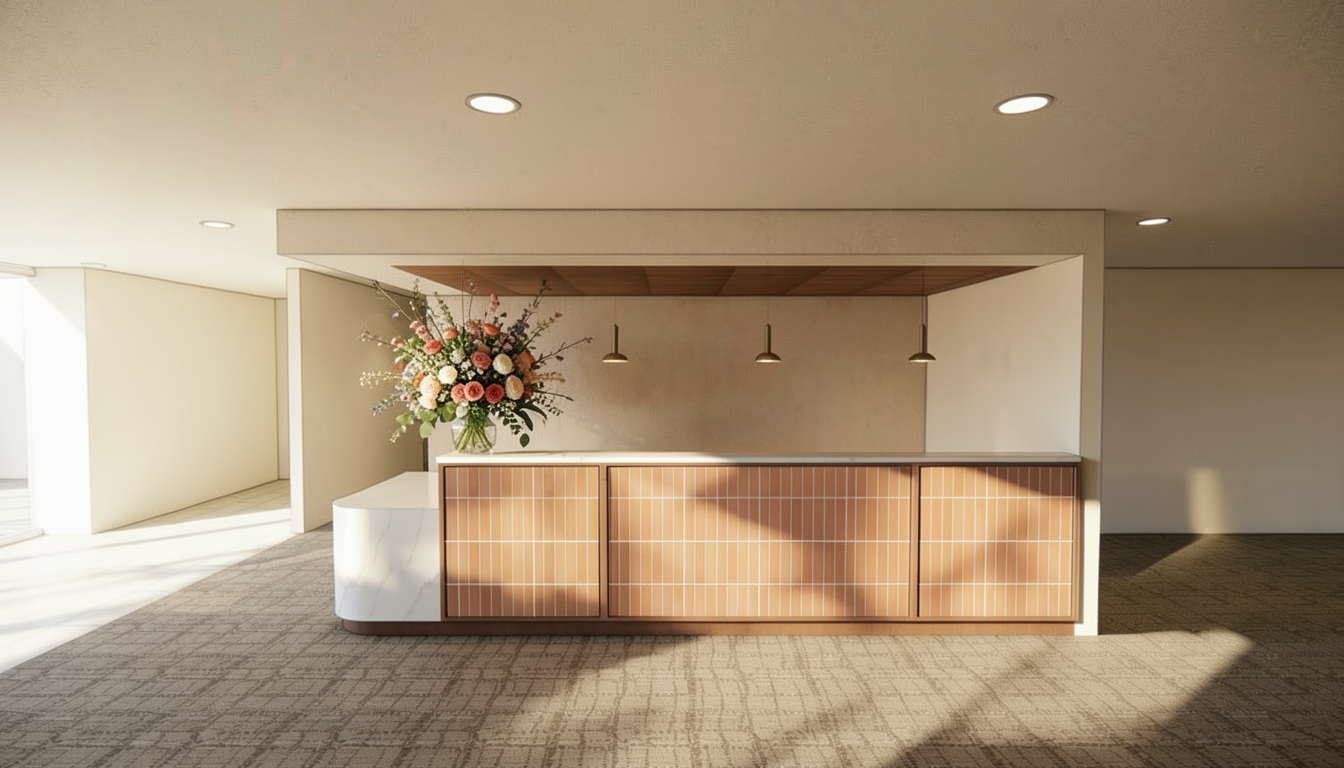 stage with a floral arrangement on white part of counter