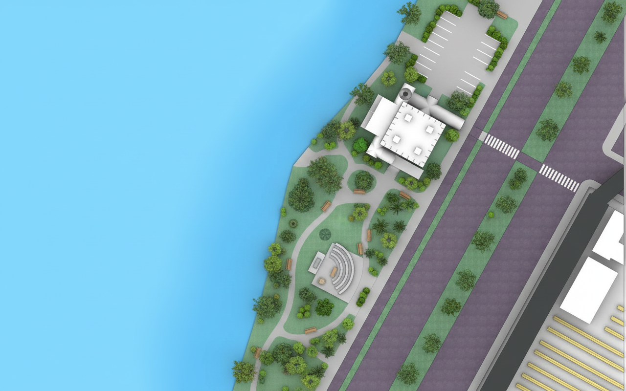do not change any existing geometry create a realistic architectural exterior rendering of this site the reference image is what the building looks like from the side use it when creating the render keep the orientation of the building the way that it is in the initial image create the rendering at eye level from the crosswalk