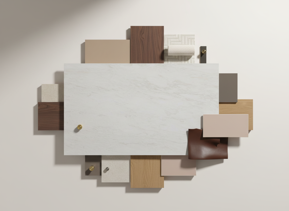 render a high end designer traditional bathroom from the moodboard featuring a slab of calacatta nambia as the countertop and shower walls show any light fixtures as illuminated and add warm sunlight from nearby windows ensure there are several plants around the space and a companion wallpaper feature behind the vanity