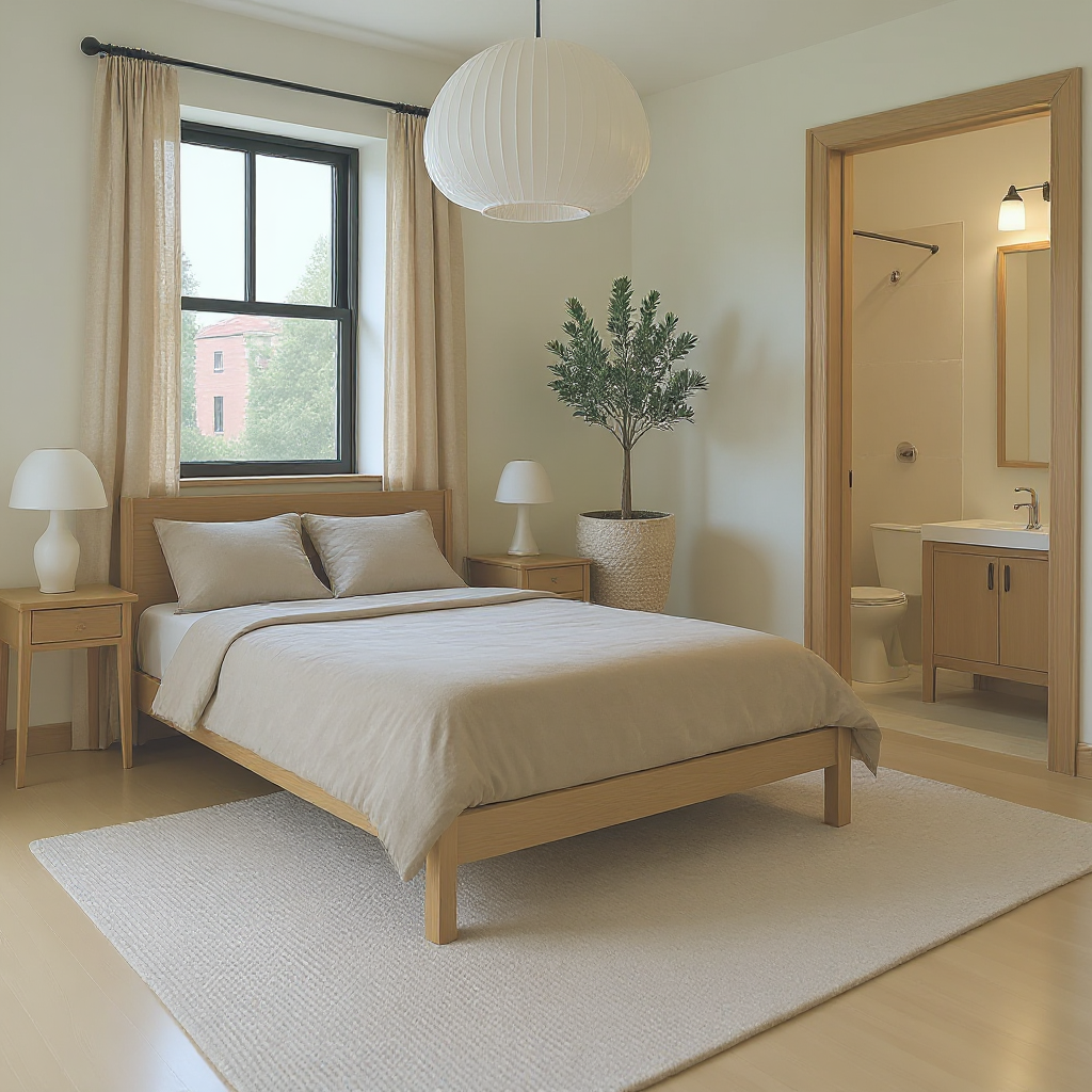 create a modern house exterior with a sleek minimalist design the walls are painted in a soft white color contrasted with large windows featuring clear reflective glass the roof is flat and designed in a contemporary style the surrounding landscape has a lush green lawn and a smooth light mocha colored pathway the atmosphere is calm and serene capturing a sunny day with a clear blue sky