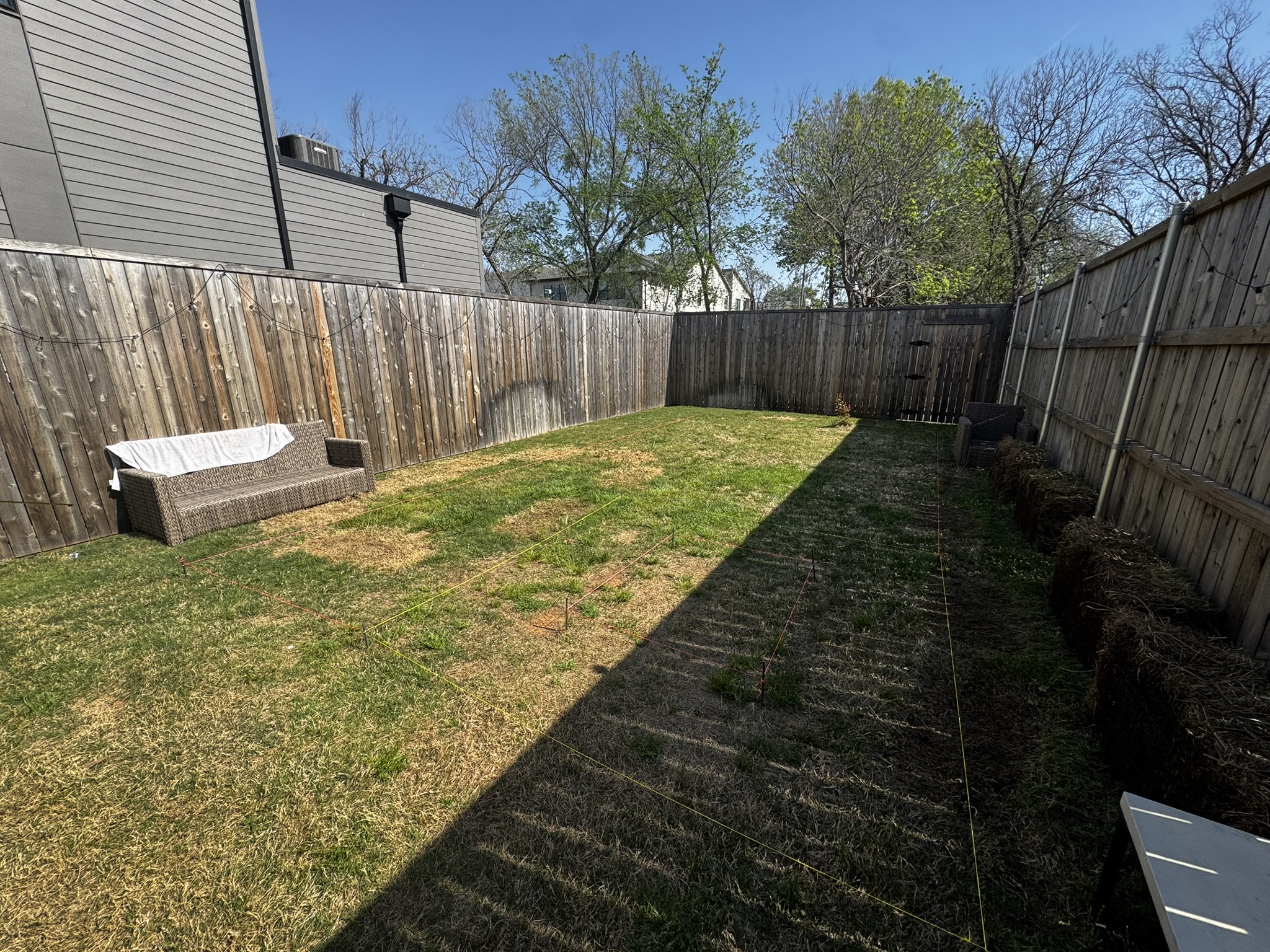 create photo realistic inground swimming pool perspective is looking from home patio into the rear yard inground pool has spa hot tub inside the pool perimeter spa is located on right side of the pool spa is raised above the pool water line 18 inches spa is approximately 7ft x 7ft to the left of the hot tub is the baja shelf or tanning ledge this tanning ledge is approximately 6 3ft wide and 7ft long with 2 bubblers the stairs leading into the pool are directly off the tanning ledge and run the length of the tanning ledge 3 stairs stairs start 12 inches back from the edge of the hot tub a sitting bench runs the length of the left side of the pool after the tanning ledge and the bench is approximately 14 inches in depth this bench makes an l and also runs along the back of the pool the right side of the pool after the raised hot tub has a 18 inch tall water feature wall that sits on the waters edge the right side of the pool does not have coping the left and rear of the pool have 12x24 light grey leuders limestone for the coping the plaster is dark lagoon like terrazo finish the 6 water line tile is dark the water line tile fully wraps the sides of the raised hot tub that is inside the pool grid the water feature wall has three four foot linear water features that are spilling water into the pool the hot tub has a centered linear spillway the water feature wall sits close to the right side fence with no planter or walking space behind the wall the fence is stained a cedar brown color with steel accent posts every 6 8ft the fence behind the wall has ivy covering and looks lush the left side of the fencing has tall cypress trees lush landscaping and turf after the trees that meet the coping and pool make rendering photo realistic