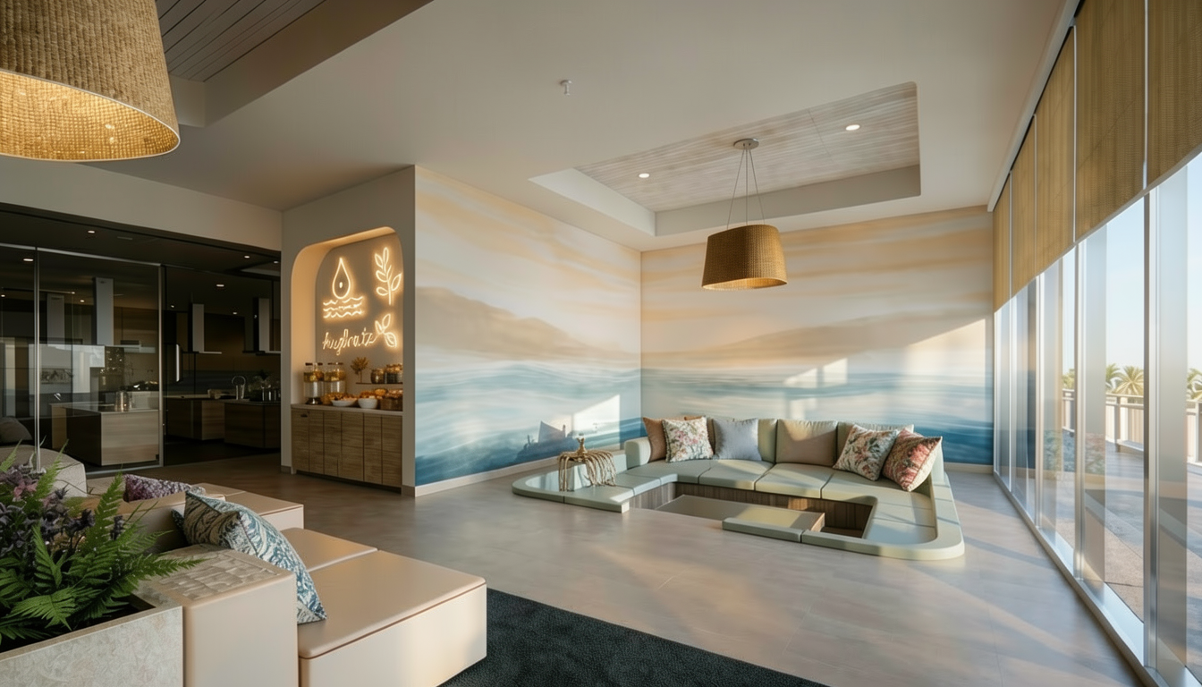 create an architectural cgi of a leisure site for elderly people in the foreground is a road which winds into the background either side of the road is soft planting to the left of the image in the background is a residential care home with bungalows in the far distance behind the bungalows and in the background is low level trees and a distant field in the centre of the image is a leisure building made from light timber and white stucco in the foreground on the left and right are the holiday lodges with soft planting in the front the lighting is soft and ambient