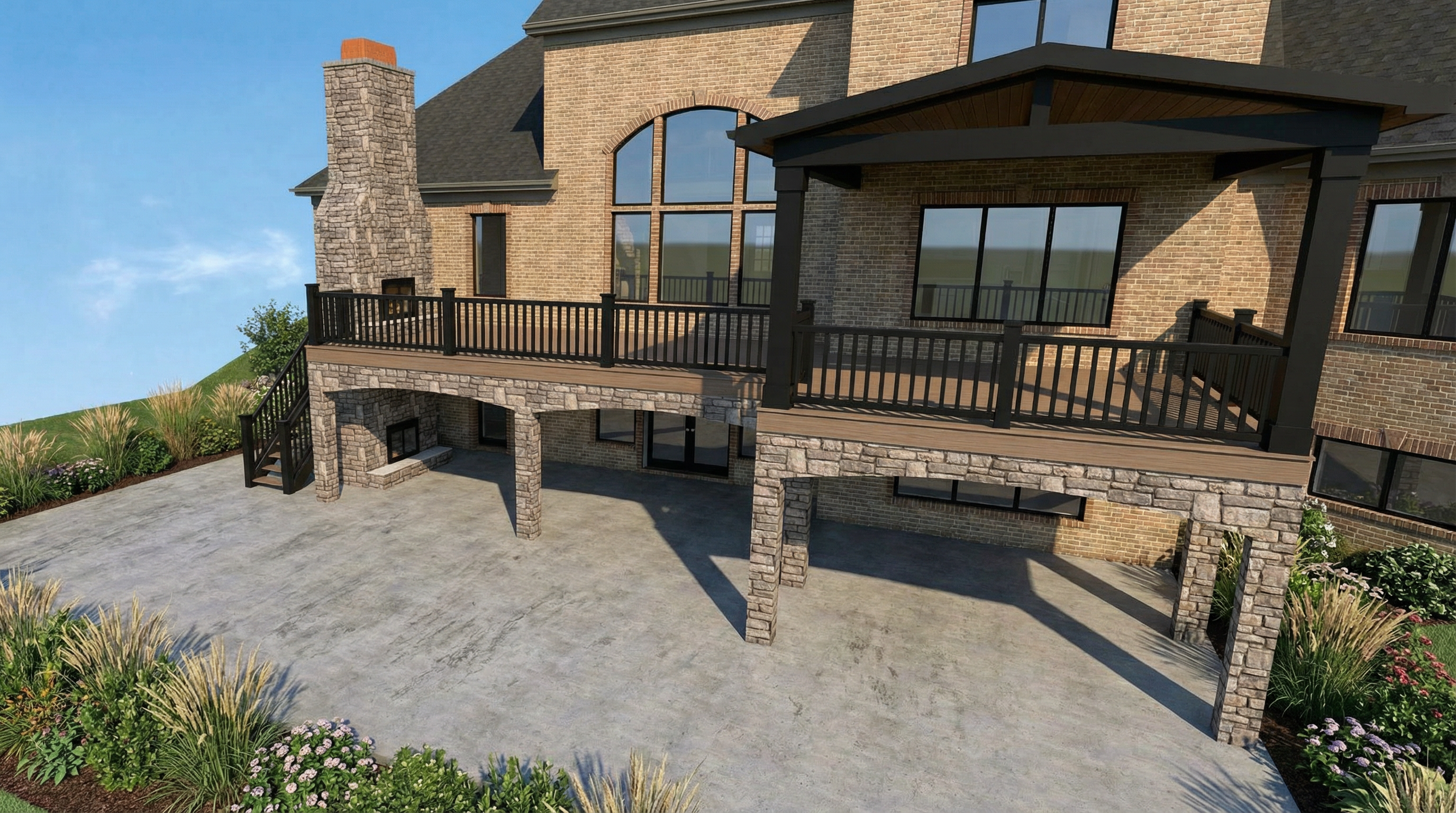a warm room with light beige walls matte walnut wardrobe and nightstand the bed is upholstered in a grey fabric with a mix of brown and cream linens the floor is a lighter wood which compliments the furniture and the door is white with glass panels but not much light comes in from there