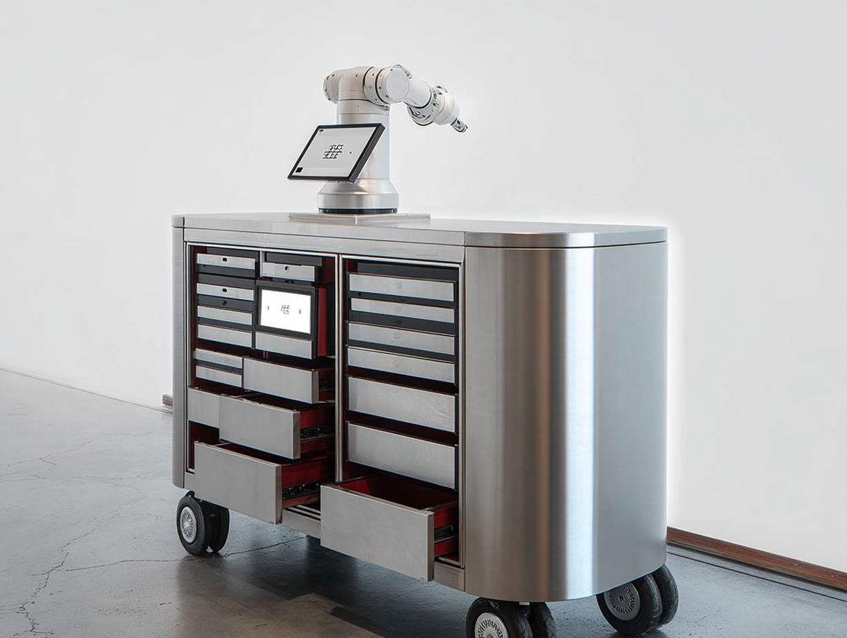 an exhibition display units for robots made to look like a work bench where the robot is displayed on top and the drawers open up to hold screens displaying more information about the displayed item the robot on display is a small cuttlefish robot in a glass water tank buttons are at the side of the display to activate the robot and have people interact with it the workbench is made up of stainless steel and wood