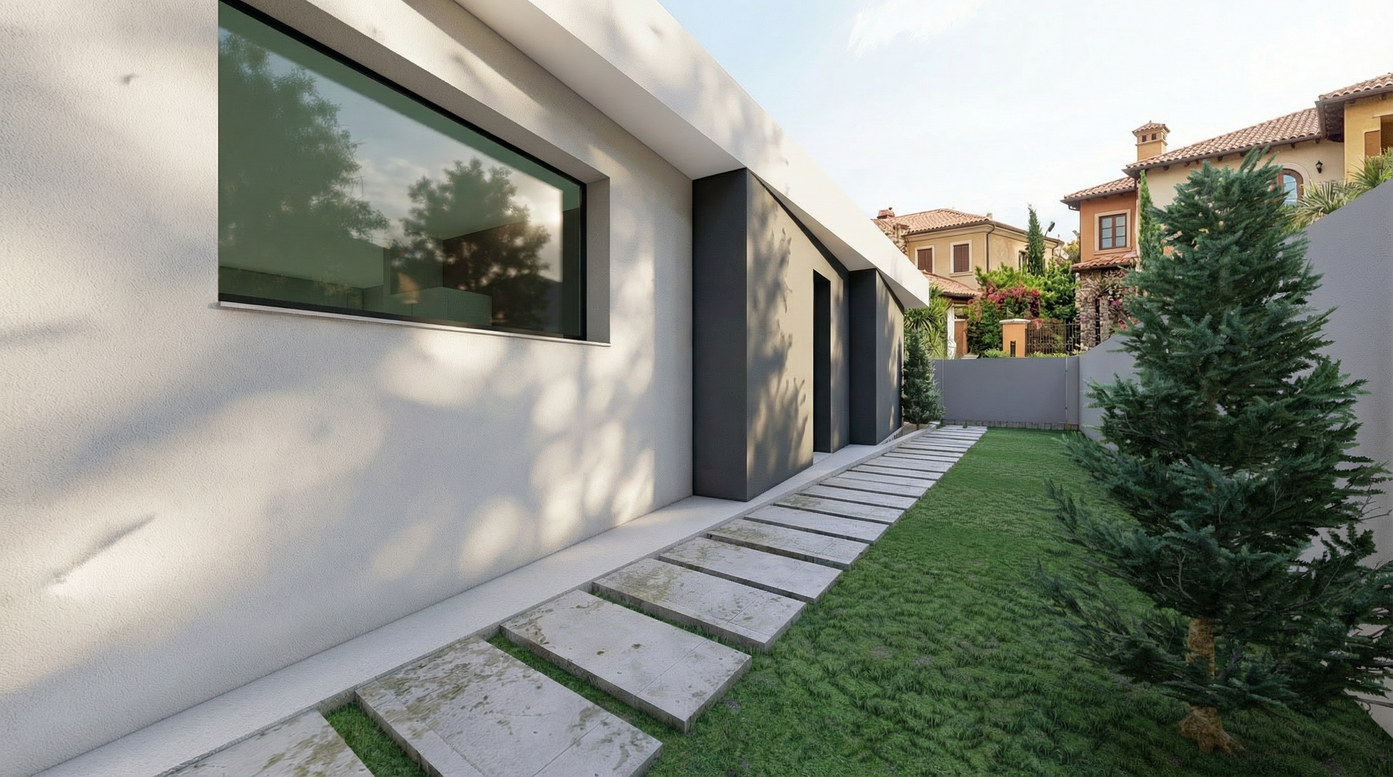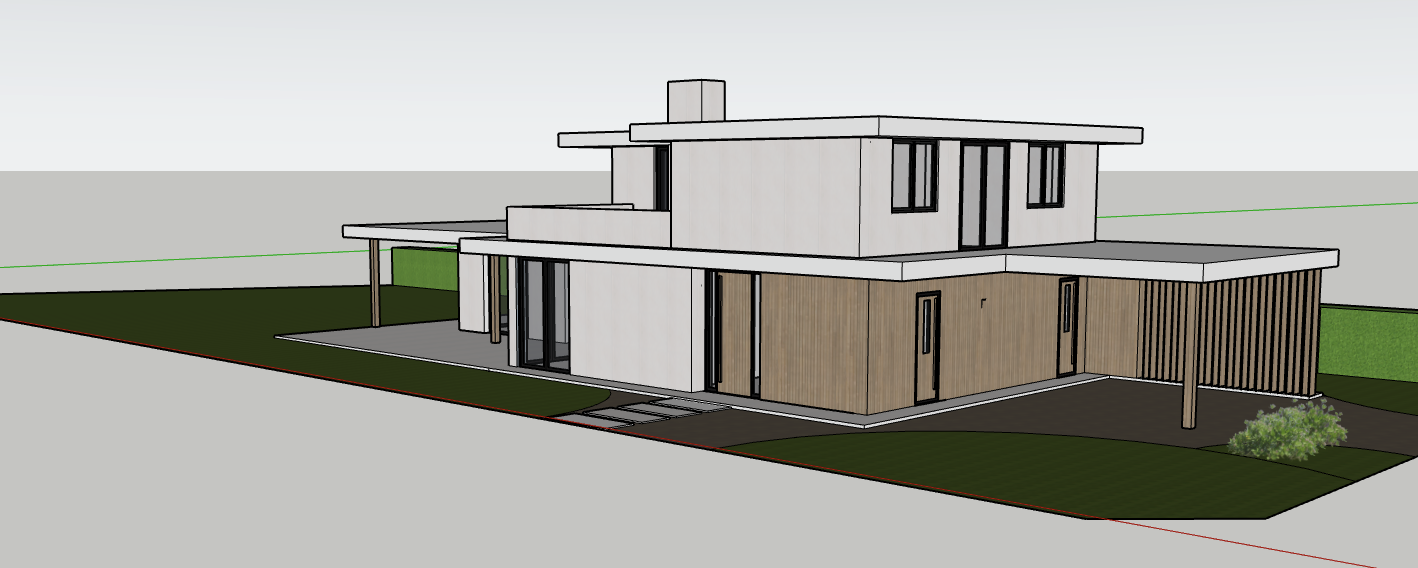 modern minimalist house in a serene landscape featuring a two story structure with large glass windows and sleek lines use a clean white fa ade with subtle beige wooden accents surround it with a lush well manicured lawn in vibrant green the sky is soft blue with hints of warm sunlight creating a calm and inviting atmosphere the setting is peaceful and modern conveying a sense of spacious tranquility it is located in the middle of the netherlands use scots pines and a pedunculate oak in the garden there is a lawn at the back of the house the roof is a clean sedum roof don t change the original building and materials