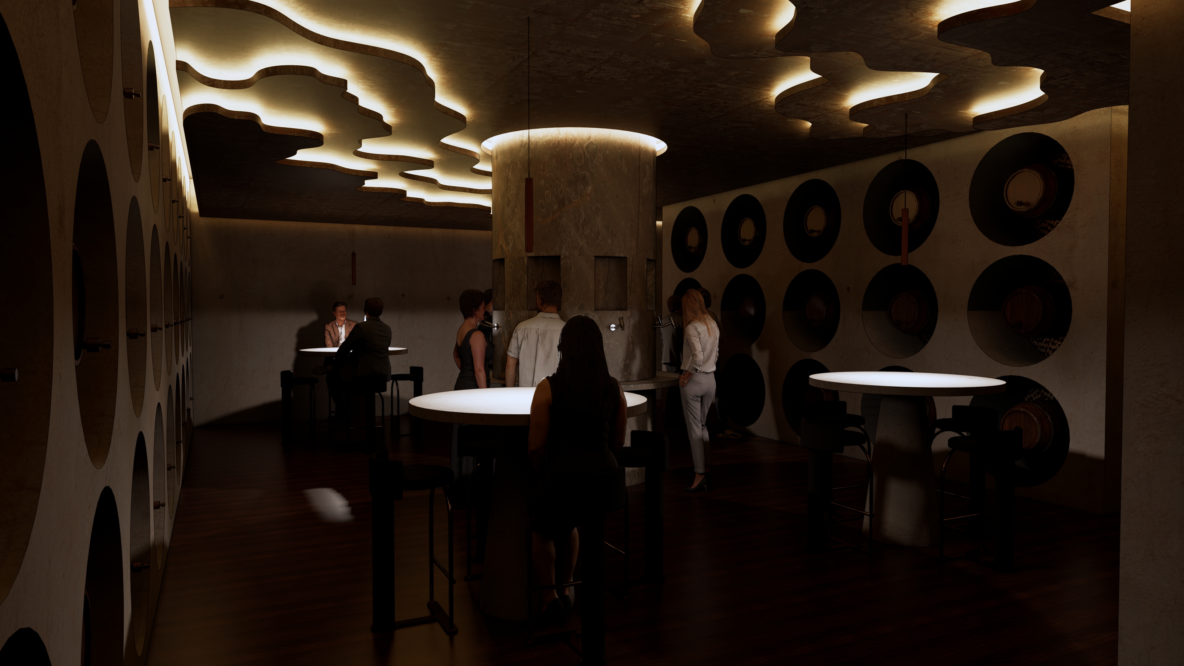 sacred barrel room interior quiet monastic atmosphere reclaimed wood floor with visible wear patterns and subtle sheen from age round concrete tables with worn edges and visible texture stone cylindrical wine dispenser in the center with small recessed niches holding wine bottles each bottle softly illuminated by warm architectural downlights large circular wall niches containing wooden wine barrels recessed deep into the wall barrels lit with soft hidden lighting from above creating shadow and depth so barrels feel anchored into the wall warm pools of light on tables creating intimate zones half full wine glasses a few wine bottles and small plates on tables chairs slightly pulled out space feels lived in but refined quiet luxury worn materials human erosion edge wear on concrete aged stone with subtle staining reclaimed wood floor with circulation wear patterns brushed and aged metal details realistic material roughness and bump visible texture on all materials lighting is layered architectural lighting not general lighting low ambient light with warm focal lighting soft spotlighting on tables so concrete texture is visible hidden lighting grazing the barrels and walls to reveal texture warm light around 2700k to 3000k very soft ambient fill around 3500k so space is dark but still readable high contrast but materials remain visible moody but readable lighting cinematic lighting film still quality chiaroscuro sacred atmosphere camera exposure balanced so materials are visible not too dark not too bright quiet reverent atmosphere like a chapel or archive space people dressed in neutral colors quietly tasting wine intimate atmospheric cinematic architectural visualization photorealistic materials depth shadow texture film grain