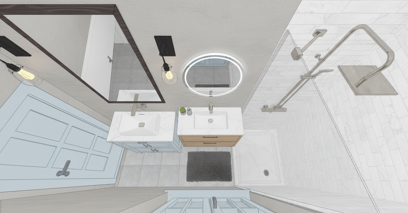 render this elevation with painted cabinets and tile behind the mirror make the cabinet color sage green