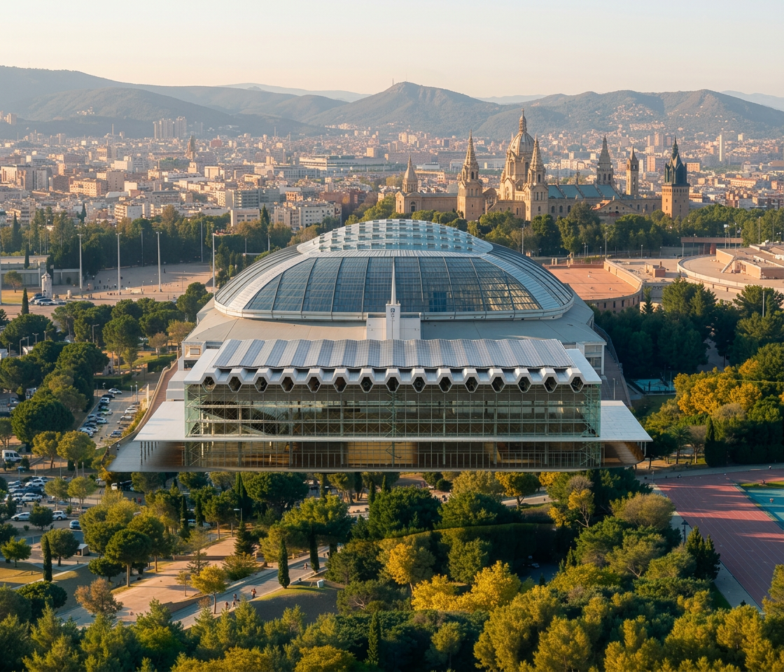 render it to be a threshold to a building but make sure the shadow stays the same make the building behind the threshold add people in it as well do not change the model keep the beams the same make sure its flat not going up understand that this is a perspective and it looks like it is going up but it is actually on the same level make the building behind it more of a glass wall building with greenery