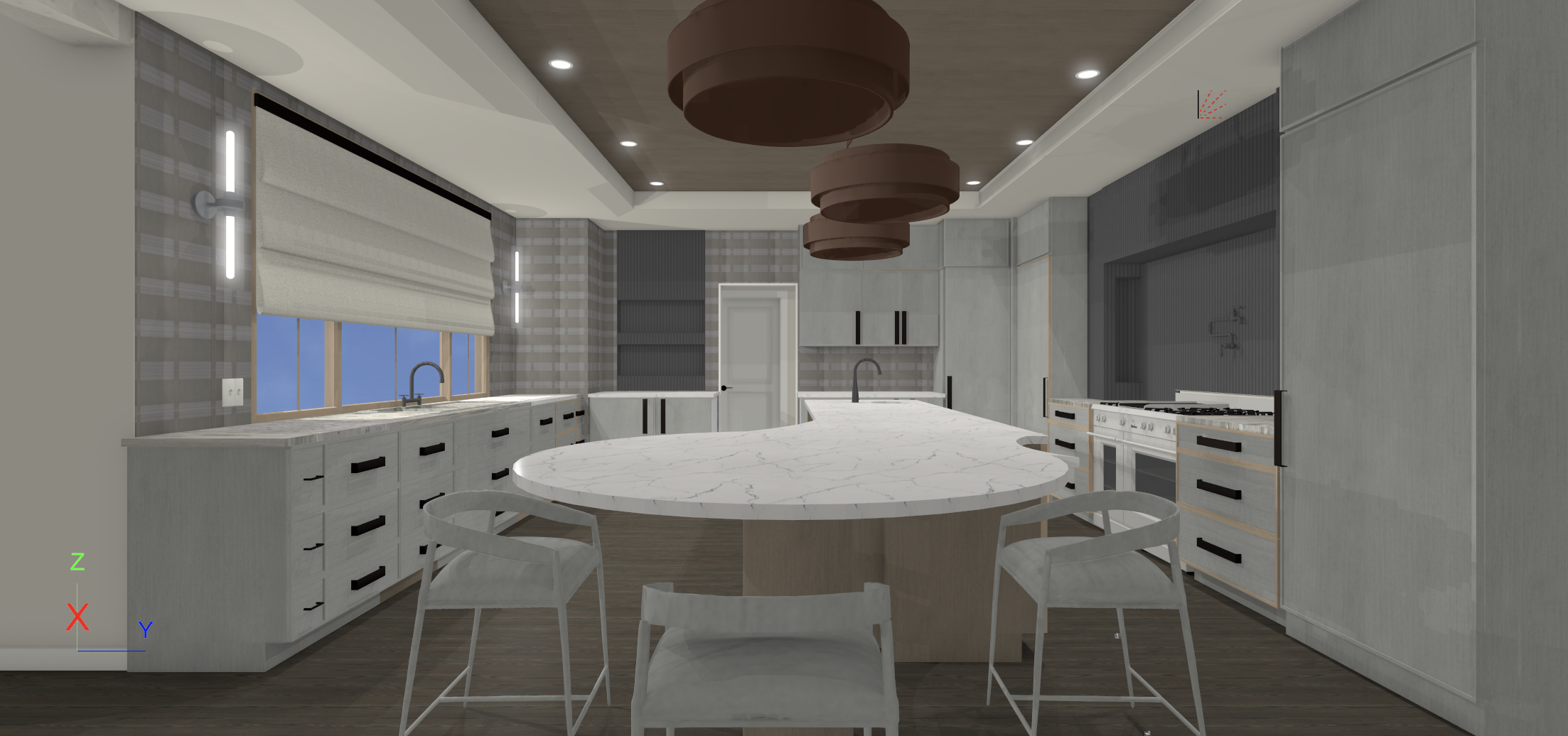 render this kitchen add a black upholstery to the stool a black ring around the pendant lights style minimally with a tree books vases i had a fruit bowl and decor on the center island make photo real add natural lighting