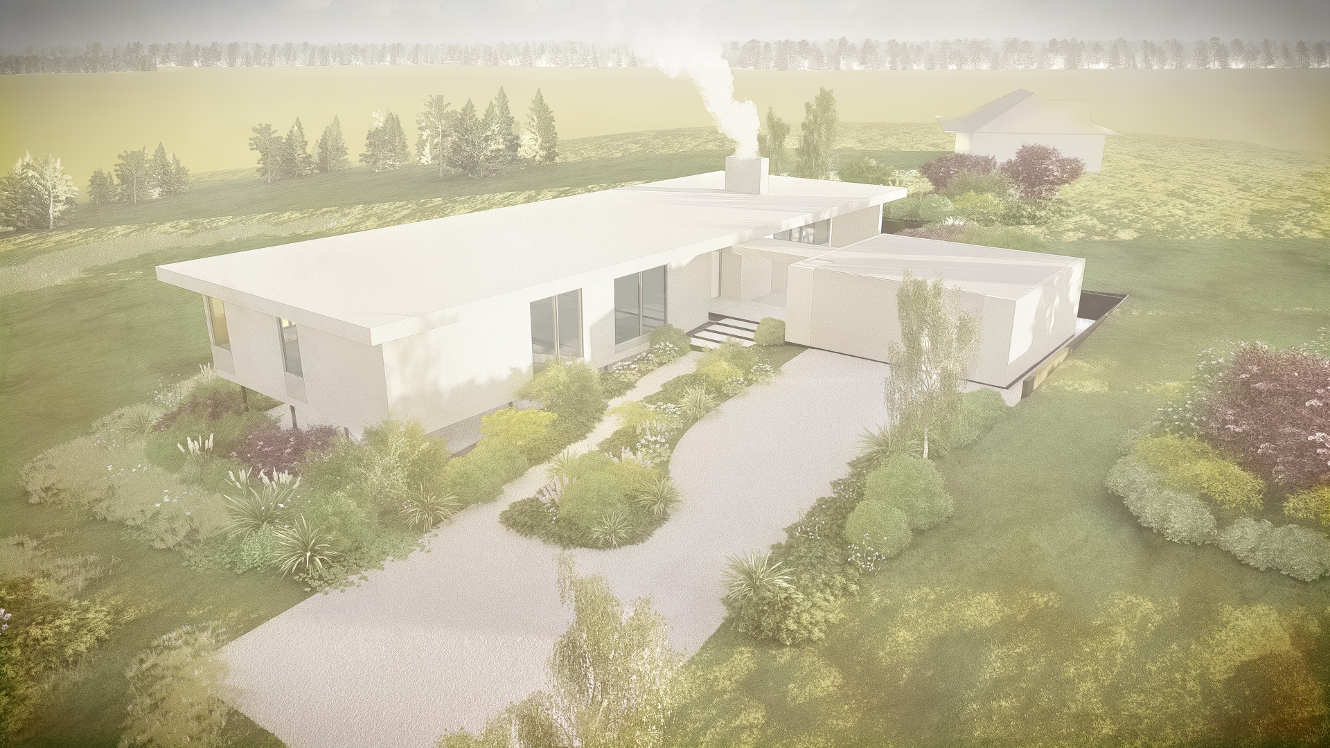 photorealistic architectural rendering of a contemporary australian rural home enhancing an existing lumion base image introduce soft atmospheric depth abundant natural light with a warm low angle sun early morning or late afternoon creating gentle highlights and soft shadows the front of the building needs direct sunlight on an oblique angle refine materiality to feel tactile and true to life metal with subtle reflectivity and imperfections glazing with realistic reflections and slight interior transparency add understated warm interior lighting 2700k 3000k to create a soft glow ensuring it feels natural and not overexposed balance interior and exterior lighting so neither dominates enhance landscaping with slight movement and realism softened edges and subtle tonal variation in grasses and foliage introduce light environmental effects e g faint haze diffused background to increase depth and atmosphere overall mood should be warm calm and evocative slightly ethereal but grounded in realism avoid overly dramatic contrast or stylisation aim for a premium architectural photography aesthetic with a cinematic softness