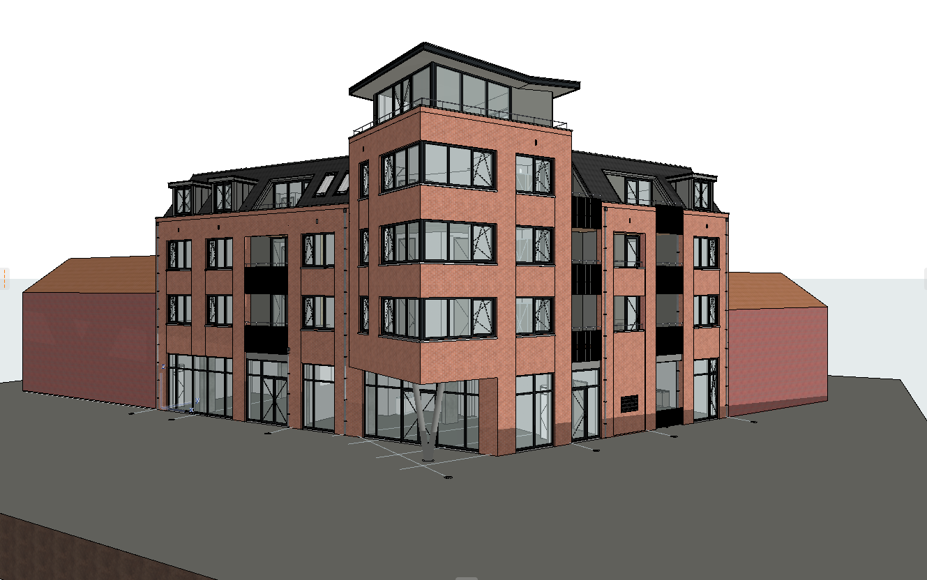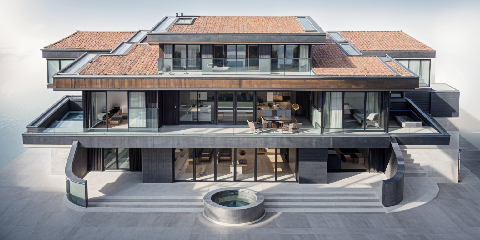 exterior shot render a modern multi story brick building with a contemporary urban feel the walls are a warm earthy terracotta with sleek black framed windows inviting ample natural light the roof is a dark charcoal gray providing an elegant contrast with the brick include large glass surfaces for a modern touch emphasize a clean polished finish with subtle textures and shadows set the atmosphere in a clear blue sky with soft natural daylight highlighting architectural details incorporate a smooth minimalist concrete pavement around the building add greenery to create a fresh and lively urban environment