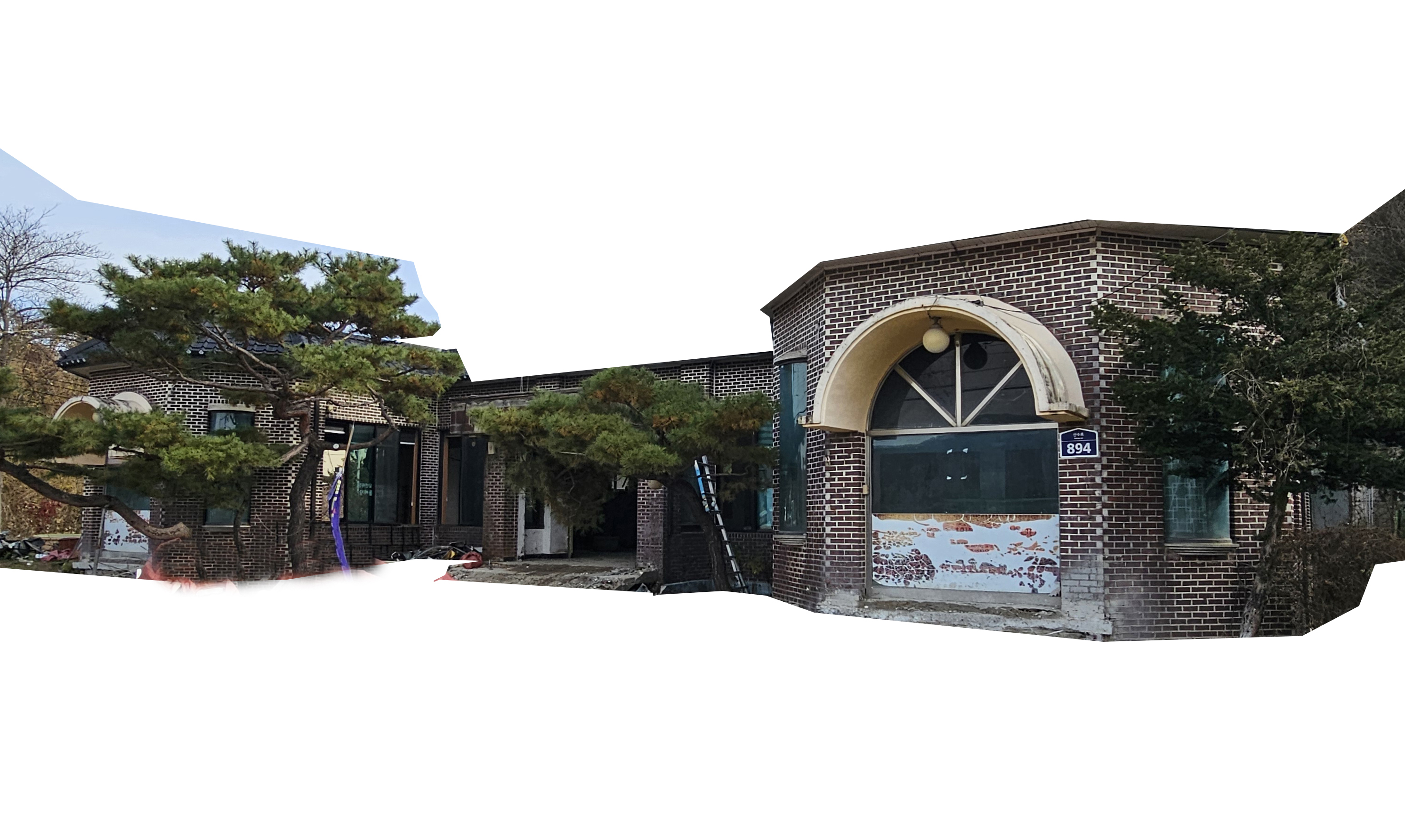maintaining the shape of the building modern style industrial black frame canopy concrete keep the canopy column appropriate wood finish and white finish while maintaining the exterior finish remove the arch the window is a fixed window frame the front garden has grass and stepping stones it s like a calm china restaurant
