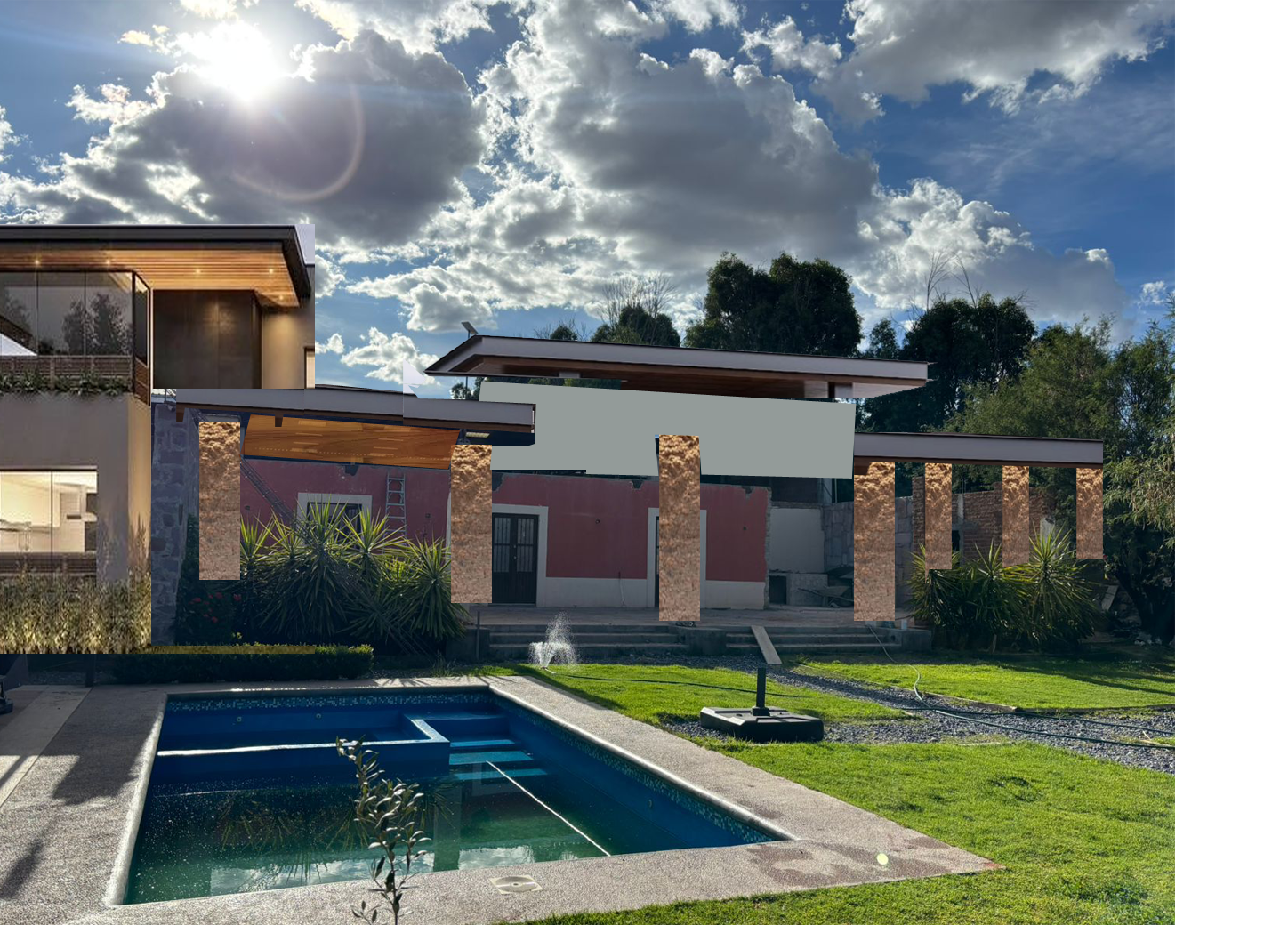 mediterranean revival exterior shot a serene outdoor scene featuring a quaint house with a rustic charm the house has soft pink walls and white columns under a clear sky with fluffy white and gray clouds the sun casts a warm golden glow creating a peaceful atmosphere in the foreground a vibrant green lawn surrounds a sparkling blue swimming pool reflecting the sunlight tall lush trees in the background enhance the tranquil setting add some blooming flowers in the garden for a touch of color and make sure the light highlights the intricate textures of the stone and brick elements architecture