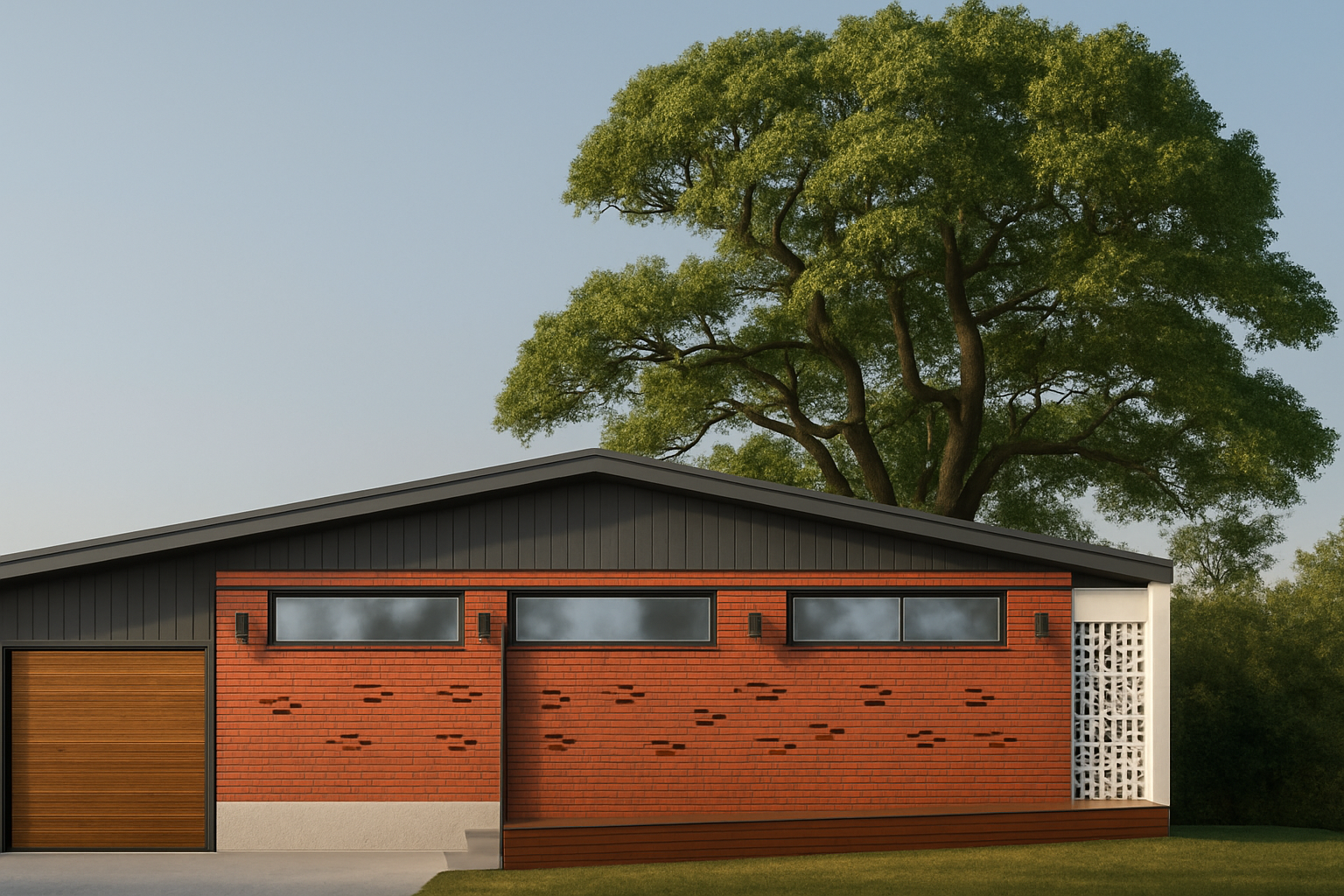 add background maintain colour tones and features as is add large tree to right side no front yard make the carport and garage to extend deeper in front and set back the house to add depth