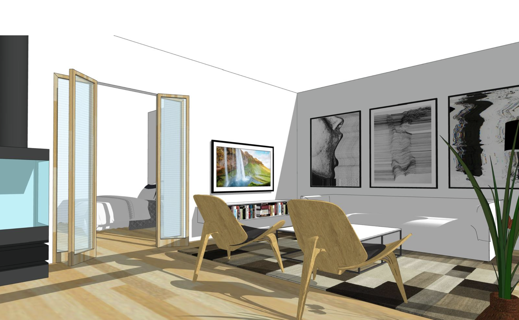 wall color is farrow and ball slippery satin which is very light beige greige almost white color floor is oak color knotless board glass doors are vertical striped glass with oak frames fireplace on the left is black and fire is on