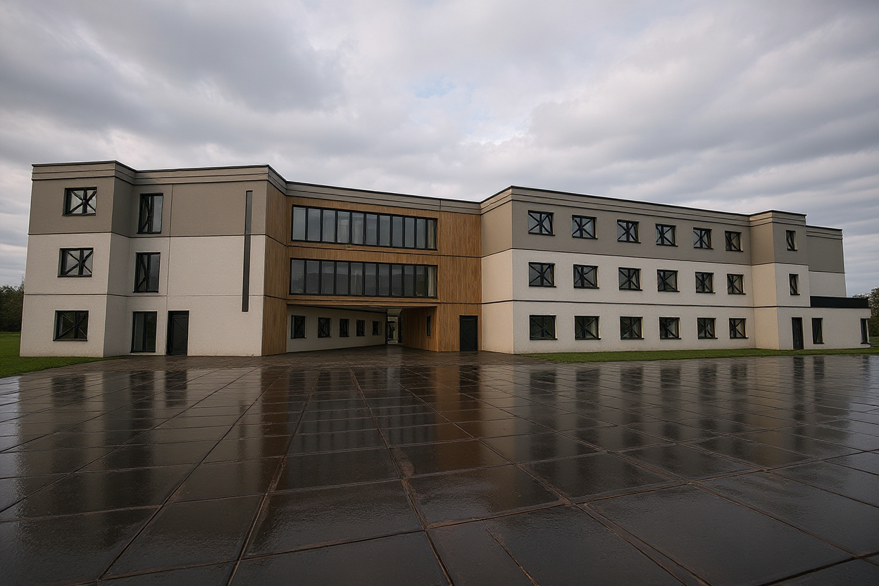 hyperrealistic cinematic view black tesla 3 in front of the garage trees in the background grass and plants in the front side of the house glass mirroring the neighborhood
