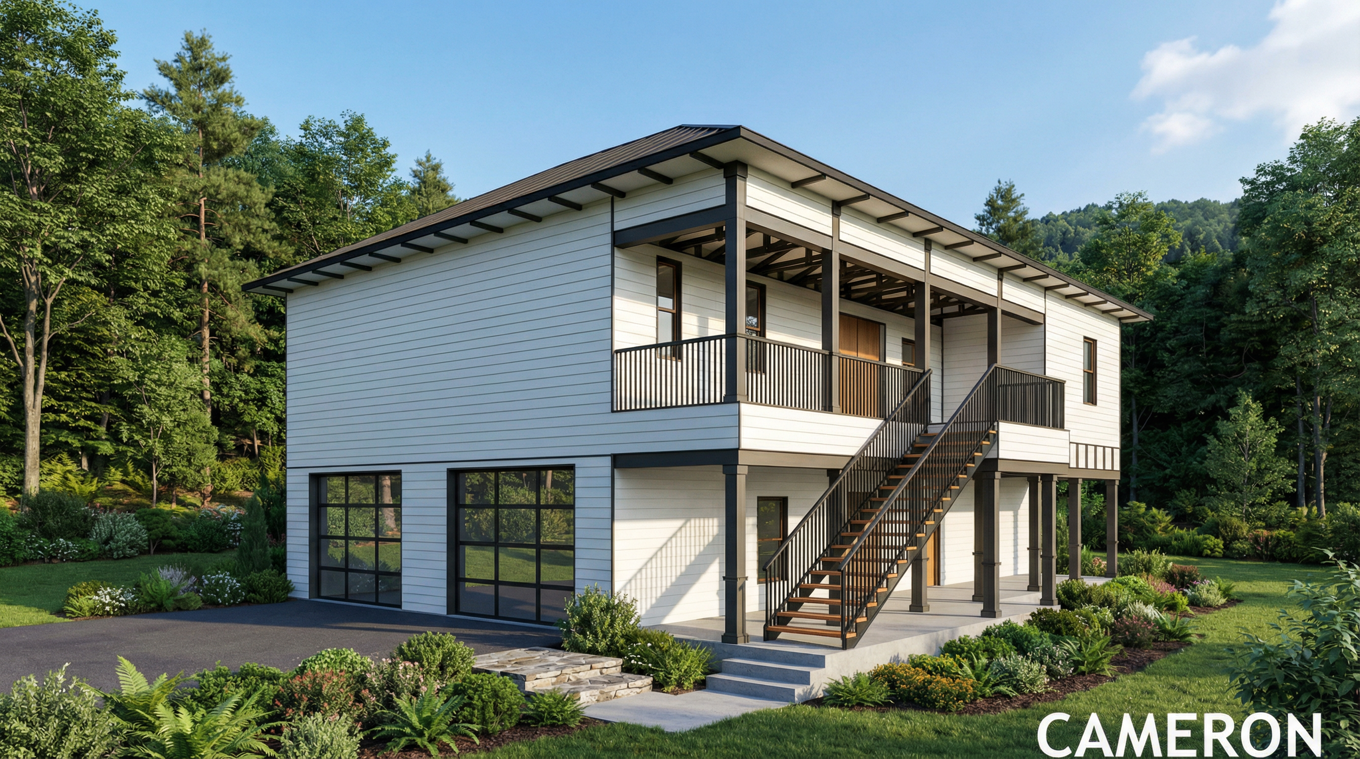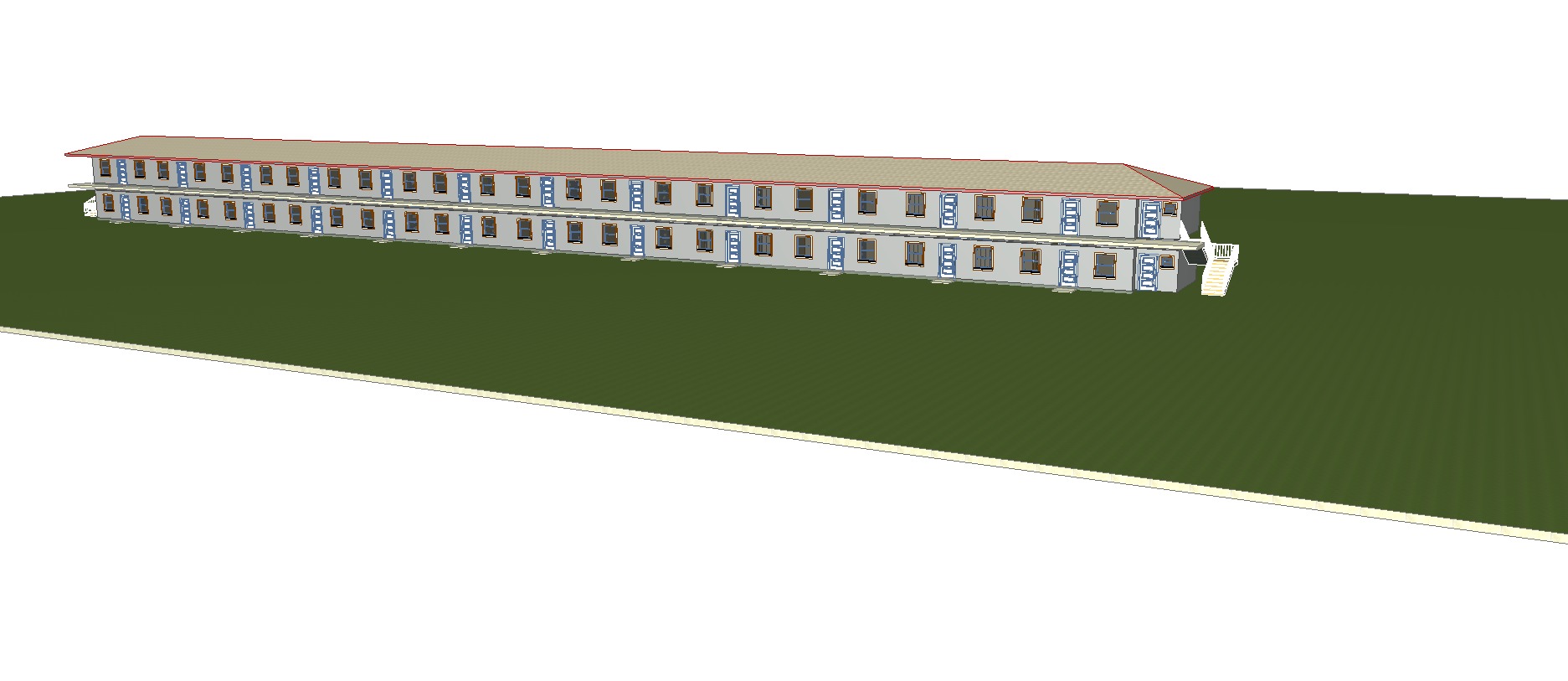 create an interesting elevation rendering of this 2 story exterior accessed 2 story building with florida landscaping parking infront of building sunset bluesky lots of lighting indirect lighting