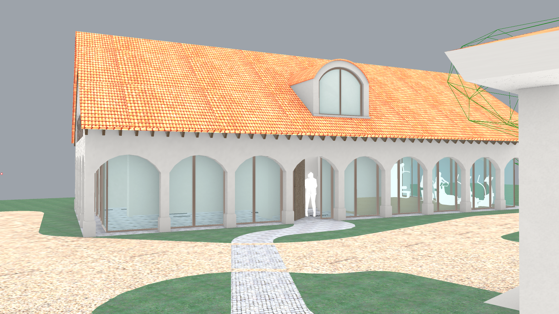 render a photorealistic 3d perspective of this house in a los angeles ca reference the current material style just enhance them spanish tile roof cream plaster keep model geometry the same windows doors same roof walls garage door pea gravel driveway make a lush mediterranean garden with lavender rosemary and soft grasses change the wire mesh trees to realistic trees no palm trees do not change the view only enhance the current materials and make the landscape nicer vegetation detailed textures in glass reflections and a vibrant clear sky with light atmospheric depth render in hyper realistic architectural visualization quality 8k resolution