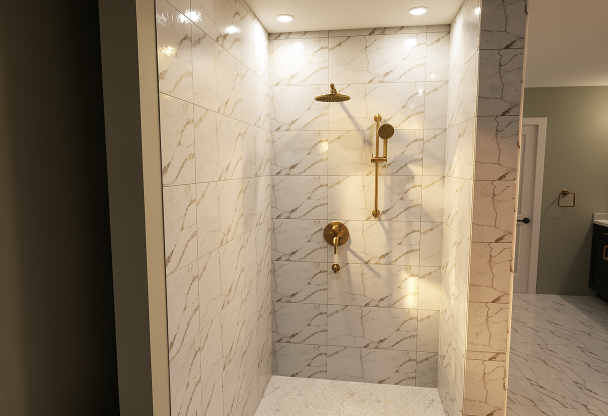 turn this into a rendering use black shingles use horizontal muskoka brown maibec siding for the 2 gables black windows black soffit and fascia white horizontal siding for the walls black garage door and gentek granada polar white stone