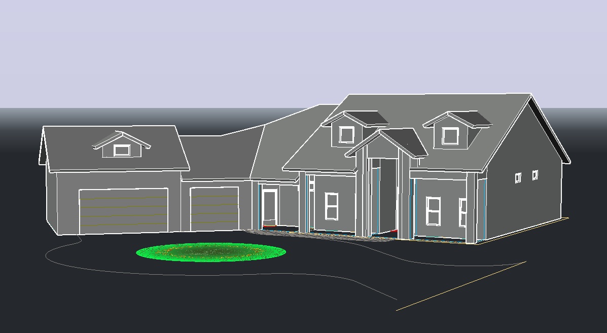 art nouveau exterior shot at 6pm with lights lit up modern farmhouse white walls and with metal dark gray roofing and a 2 car garage on the left and 1 car garage beside it white hardi plank horizontal exterior walls surrounded by lush greenery in florida setting plain concrete porte cochere surround it with palm trees and a dawn setup with lights lit up architecture