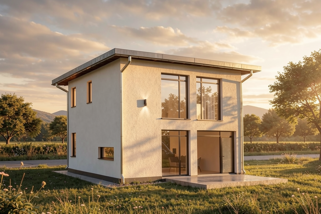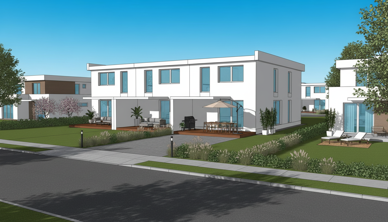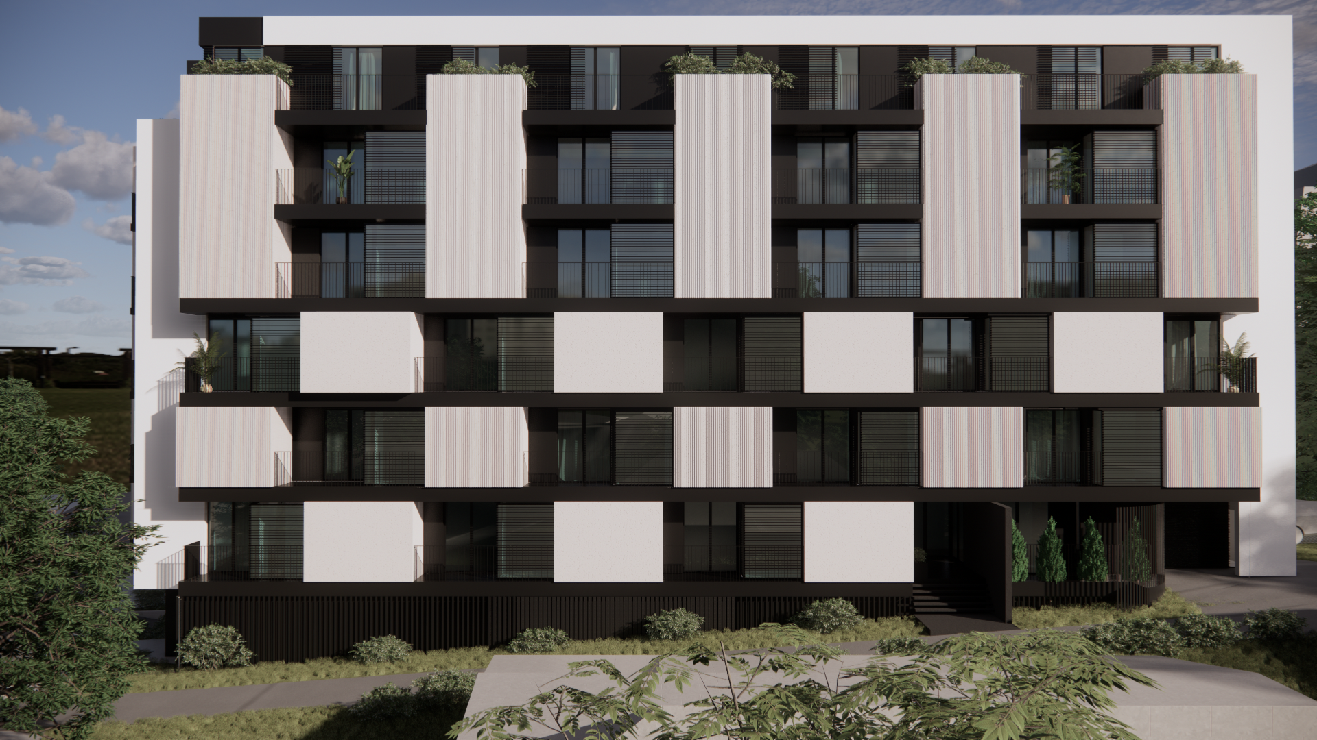 residential building keep the architecture keep the colors as they are keep the geometry keep the colours as they are keel the vertical cladding where it is but in white color keep the day time keep the sun angle side walk realistic