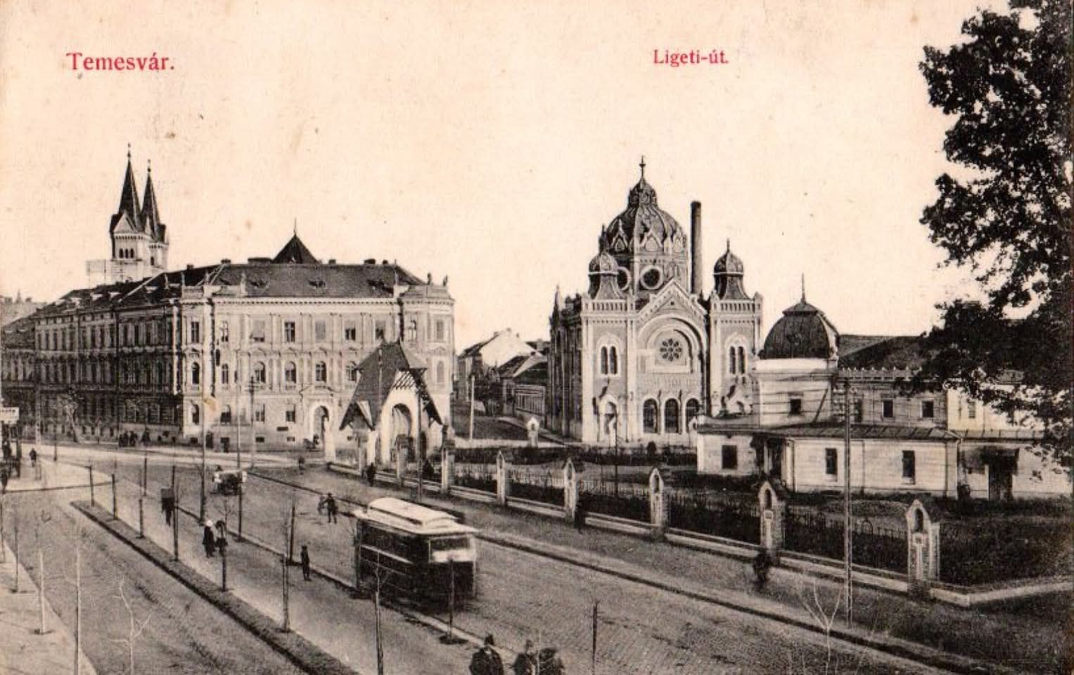 sunny day from east more hyperlight cinematic realistic rendering beautyful clouds 1900 s style dressing people coach cart with horses far away black tram in front of the building remove text from the picture paved road warm color stucco fassades