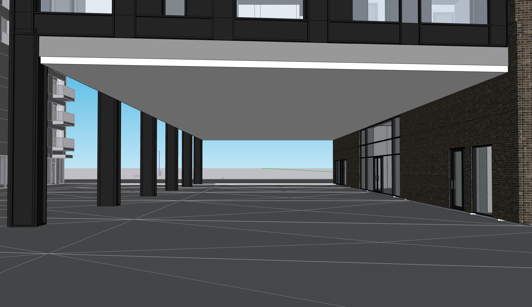 i want the space to feel joyful and to lead naturally toward the riverside boulevard the fa ade on the right side should include greenery and light panels the ceiling should be reflective with a mirrored finish and feature hanging artistic installations or ribbon like lighting add small urban furniture people exhibition stands art and greenery to the square the columns should also be covered with plants introduce a painted ribbon like pattern on the ground surface
