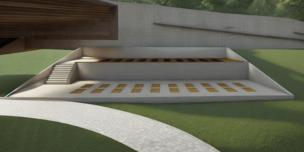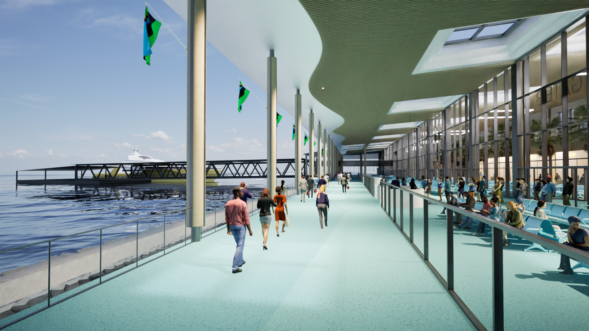 the image depicts a modern airy interior space with a glass wall overlooking the ocean and a bridge in the distance people are walking and sitting in the area and flags are hanging from the ceiling