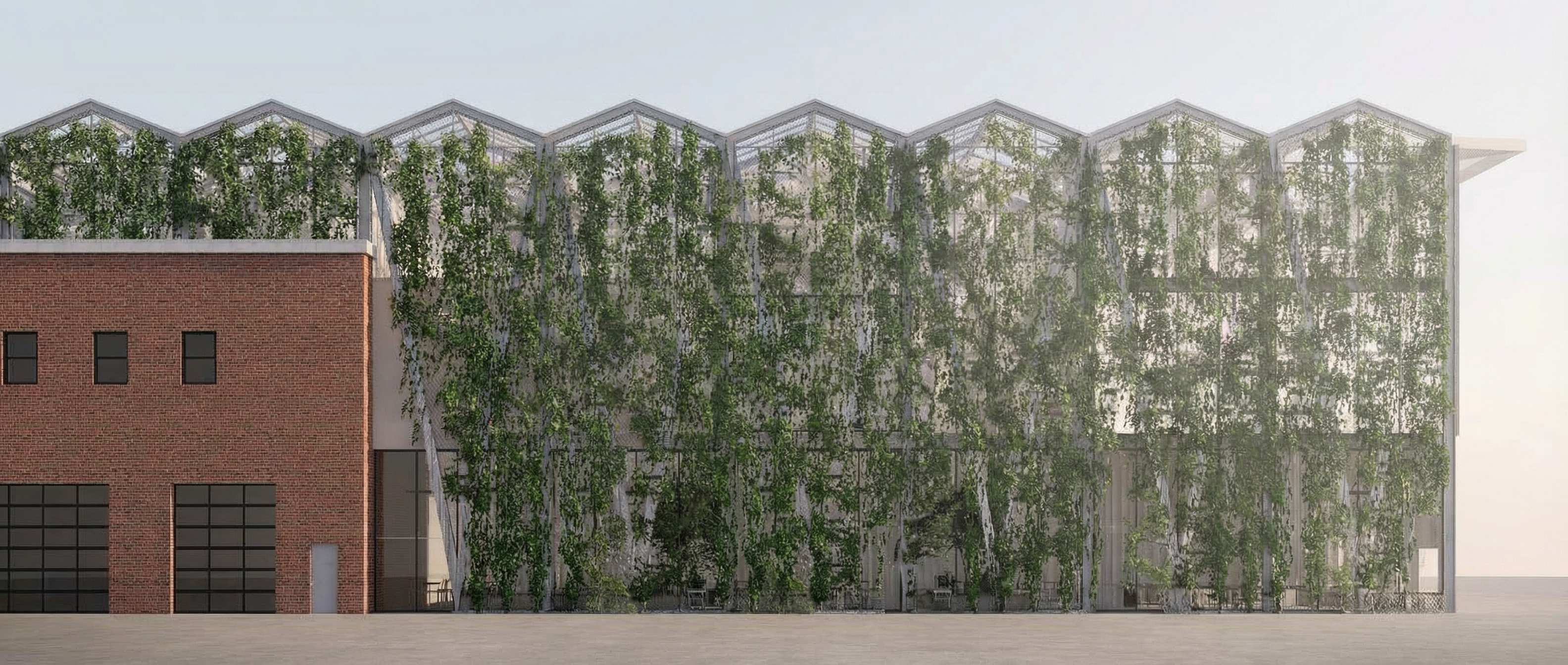 maintain the starter image as a fixed straight on orthographic elevation do not add perspective do not shift horizon do not crop or zoom do not reinterpret depth the view is already correct you are not allowed to change it apply only the visual aesthetic of the reference image soft daylight haze desaturated calm tones matte diffuse lighting subtle foreground atmospheric depth without changing camera airy realistic vegetation texture light mesh visibility behind vines evenly distributed greenery with some gaps and randomness more atmospheric softness rather than 3d exaggeration treat the input as a rendered elevation sheet you are doing style transfer not scene rebuilding any change to geometry proportions framing or perspective is an error