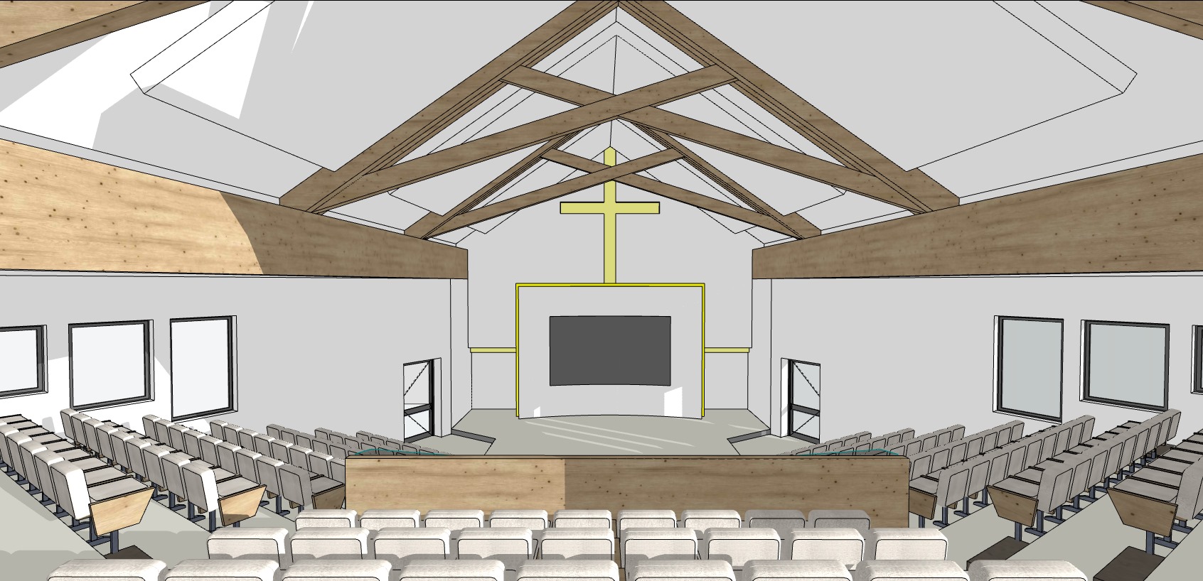 create a photorealistic interior render based exactly on the provided church design image preserve the exact architecture perspective composition seating layout stage position wall geometry roof shape exposed wooden trusses proportions and all existing design elements do not redesign the space transform the yellow highlighted elements into integrated architectural warm white light features inspired by the reference pentecostal church image the cross behind the stage must become a large luminous architectural cross clean and elegant with soft warm white glow the horizontal and vertical yellow lines around the stage wall must become recessed illuminated light bands built into the architecture similar to the reference image keep the lighting minimal sacred modern and visually powerful the black central rectangle is a screen monitor replace it with a realistic pentecostal church worship screen display showing a clean modern worship visual with a christian pentecostal message subtle sermon slide or worship lyrics elegant and believable appropriate for a live church service the white gypsum ceiling volumes must remain and be enhanced as modern architectural ceiling features add recessed spotlights inside these gypsum ceiling volumes add hidden indirect led backlighting behind the ceiling volumes so the volumes glow softly from behind keep the effect refined premium and integrated into the ceiling architecture replace the floor finish with soft beige wall to wall carpet light warm beige church carpet elegant clean acoustic and suitable for a pentecostal sanctuary keep the entire color palette clean bright white with a fresh minimal modern pentecostal church atmosphere all wood elements must remain natural wood with warm realistic timber texture the wooden trusses and wooden wall elements must stay visible and authentic lighting should feel warm white around 3000k 3500k bright but calm reverent welcoming spiritual layered architectural lighting with luminous cross ceiling backlighting spotlights and subtle ambient stage lighting make the final result look like a real contemporary pentecostal church interior highly realistic elegant sacred minimal and buildable