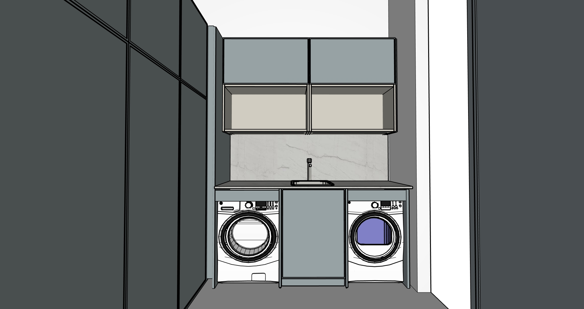 crea una imagen fotorealista a partir de esta de sketchup es una lavanderia