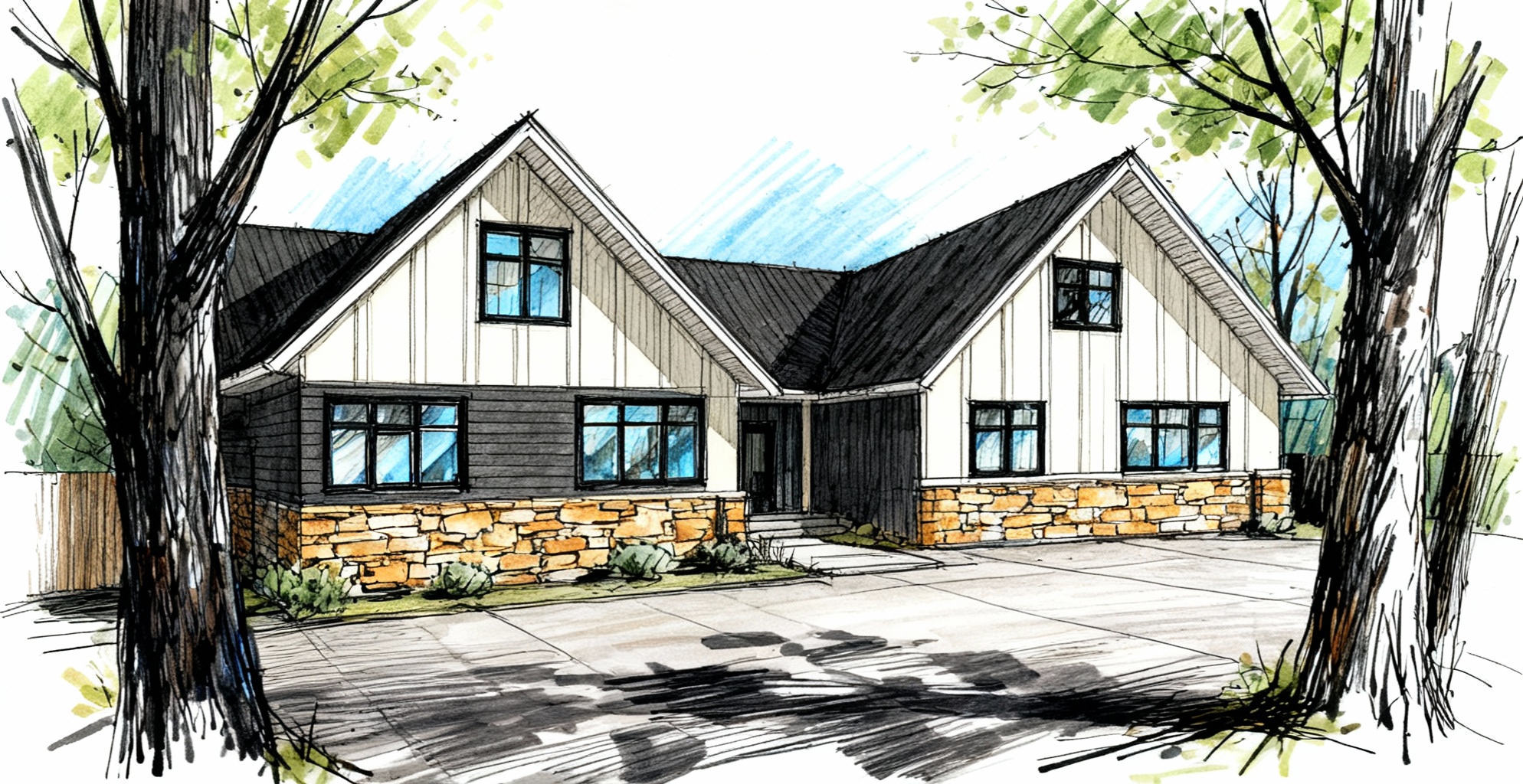 exterior shot render this perspective of the same house in the reference image use the same materials same vegetation same atmosphere do not change the form or materials of the building and pavement be careful to not obstruct the concrete pavement
