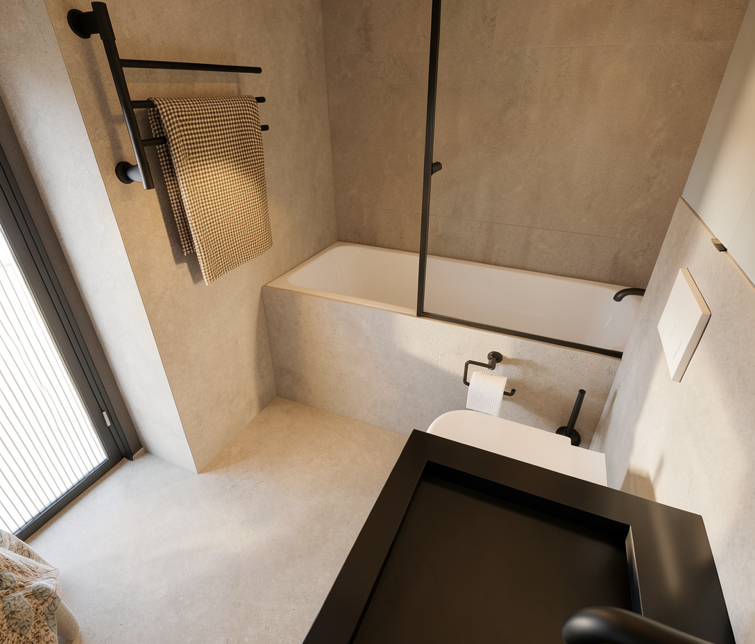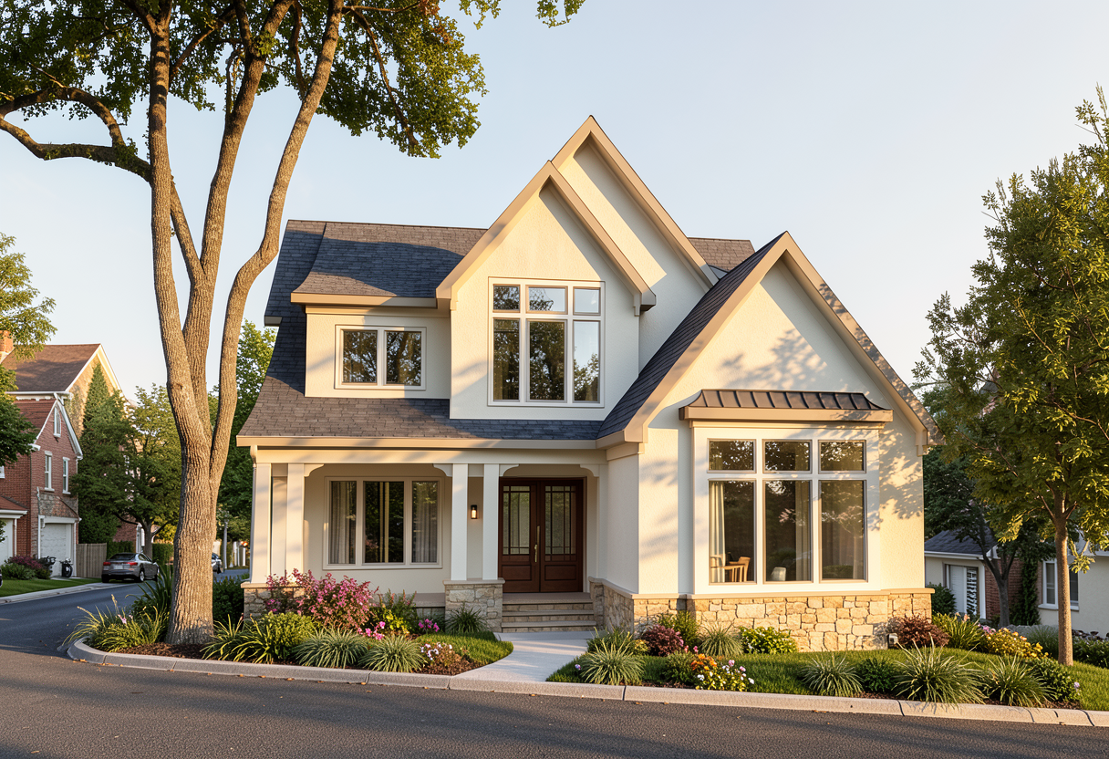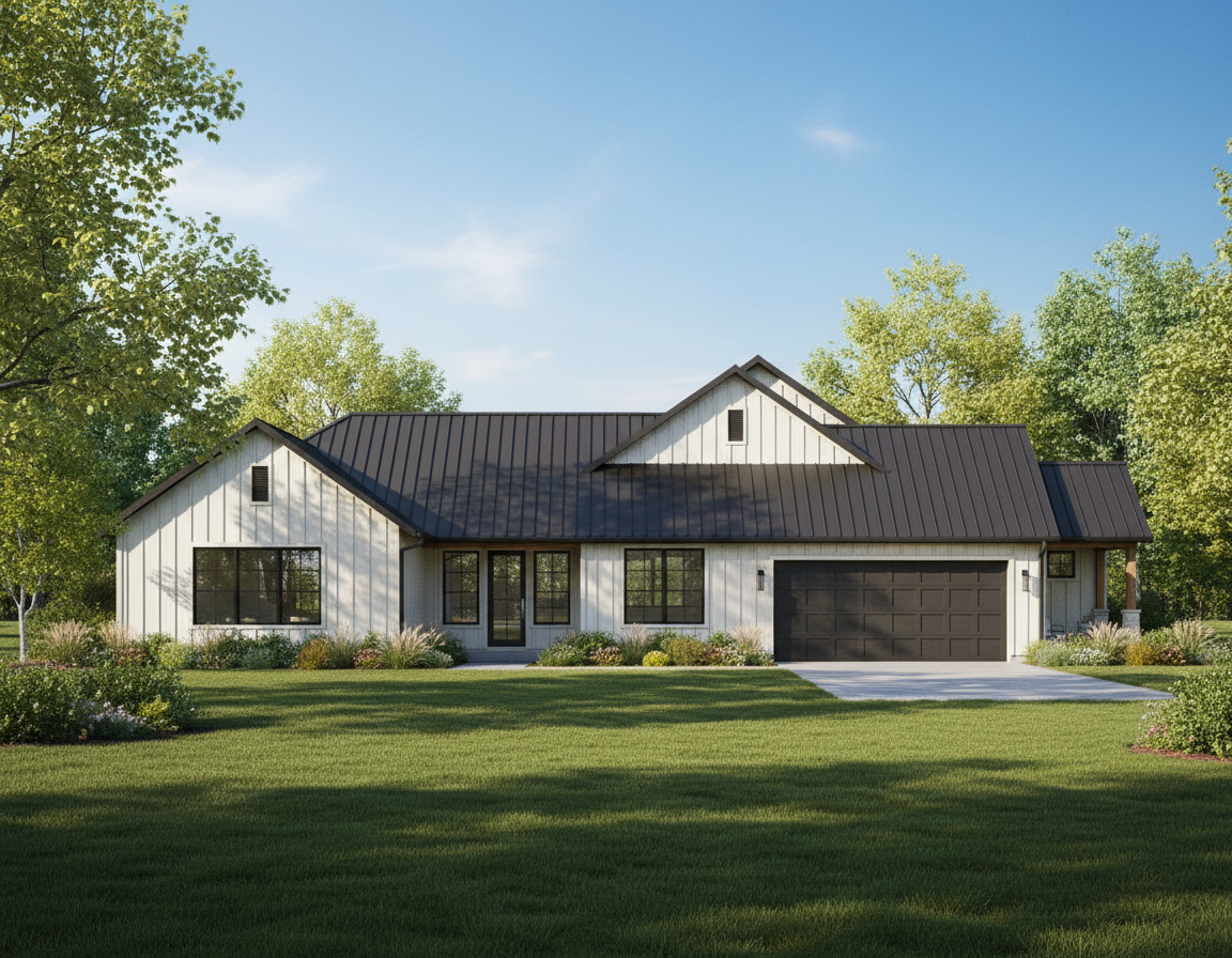 photorealistic architectural rendering of the provided breezeway image replace all existing stone veneer with natural limestone cladding matching the reference image irregular random ashlar pattern warm beige and light tan tones subtle texture variation natural mortar joints in light grey add realistic exterior grading and driveway sloping gently up toward the entry door concrete driveway with light broom finish texture proper grading around foundation with subtle soil transition and clean edge along building warm natural daylight soft shadows realistic material textures high detail sharp focus camera angle same as original image professional architectural visualization style