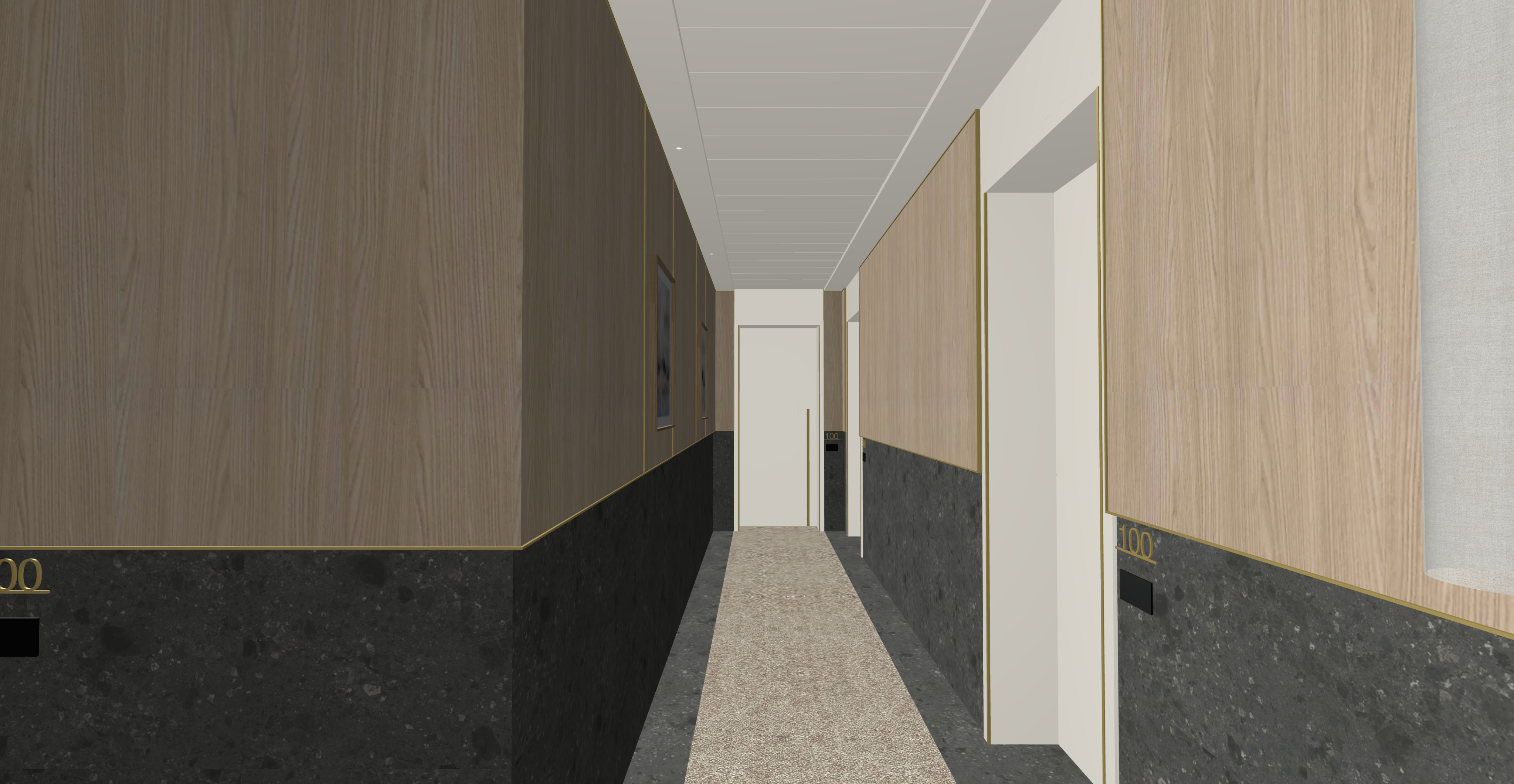 inserisci strip led sotto la boiserie in legno rovere che spara verso il basso rovere leggermente sbiancato il rivestimento grigio fragmenta nero ombrato ariostea opaco strutturato luce naturale da sinistra ad inizio corridoio la moquette a terra ha un pelo medio basso color tortora leggermente cangiante le parti metalliche sono ottone satinato le parti bianche delle porte sono laccate lisce il soffitto tinteggiato bianco opaco