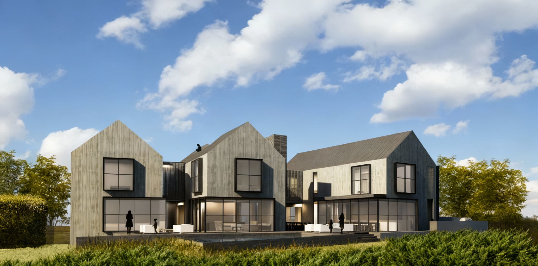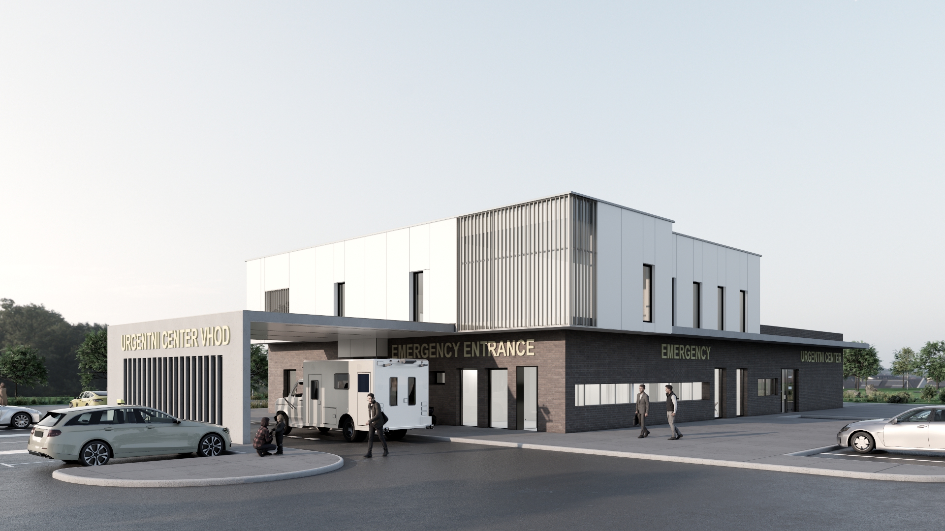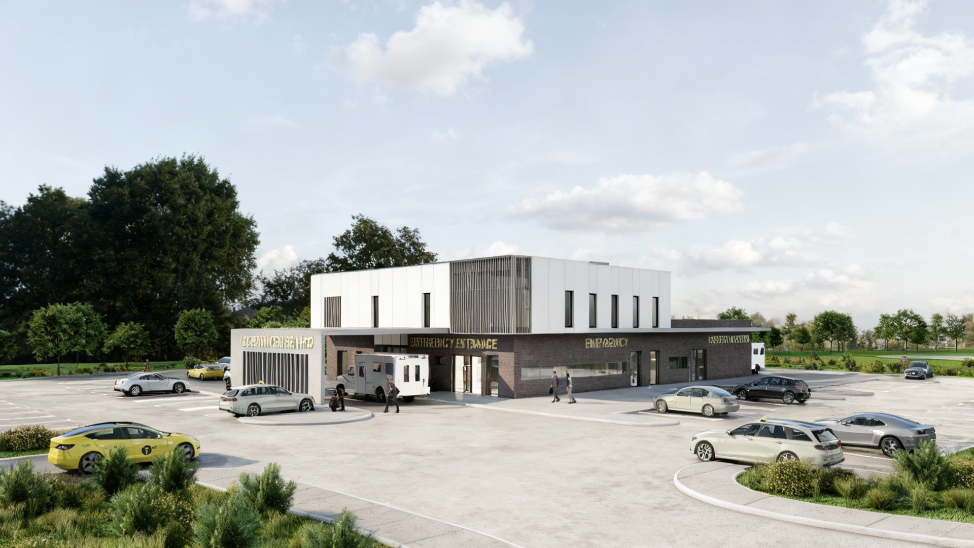 keep the pavement the same in concrete clouds in the sky lots of greenery and trees preserve all existing text on signs and surfaces grey reflections in the windows bright entrance audi a 6 and marcedes on the parking architecture
