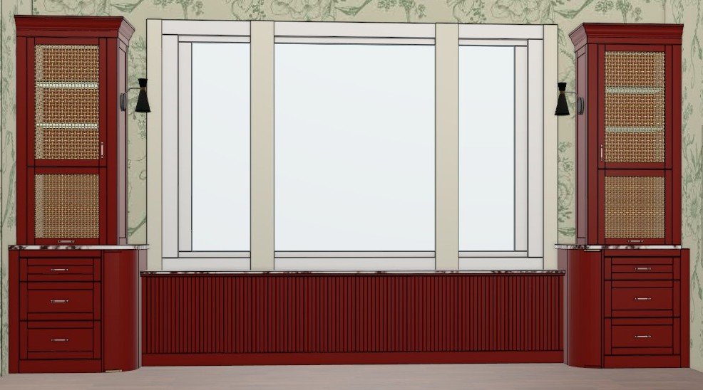 the cabinets are painted dark red 20 sheen the countertops are white with red veins the window looks out onto bayshore blvd in tampa fl