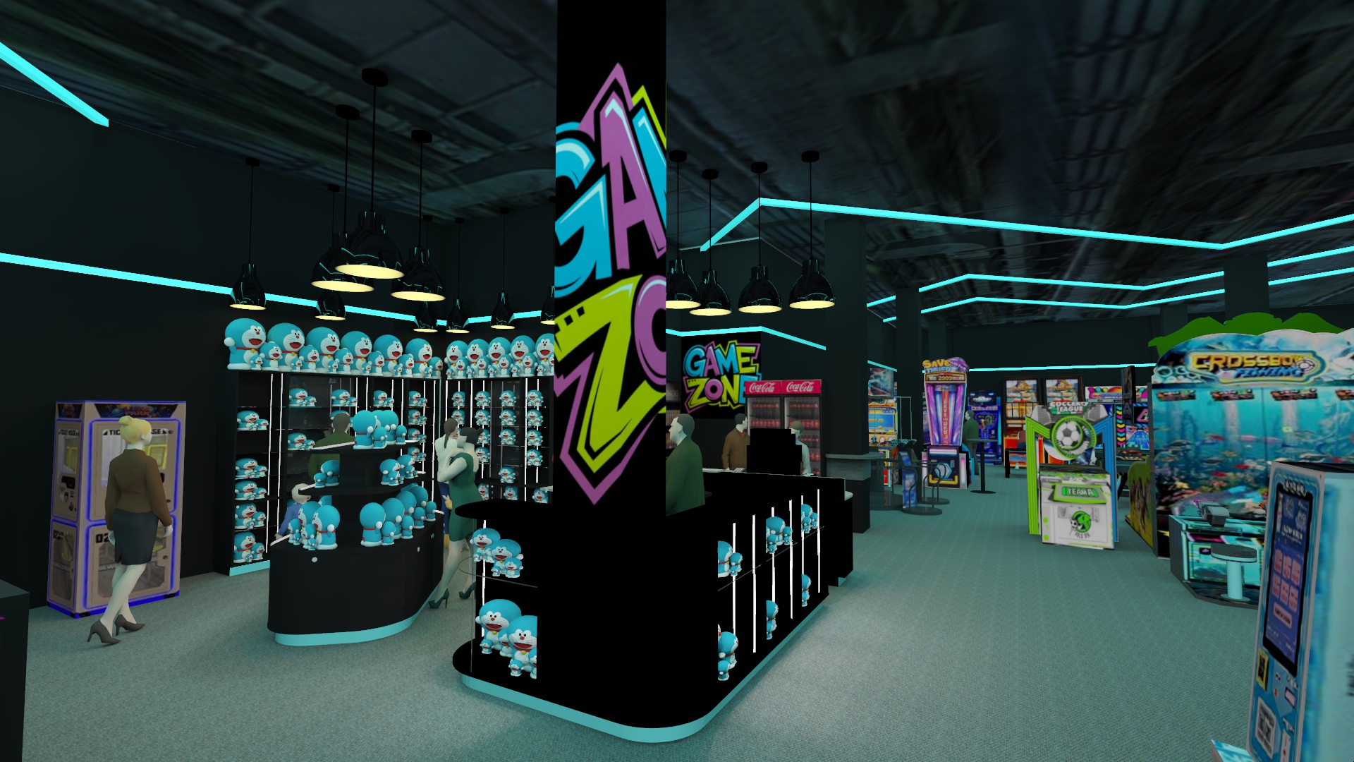 an arcade and gaming hall the machines glow brightly black walls and a black ceiling the floor covered in gray carpet turquoise light lines on the ceiling and turquoise lighting under the furniture create a photorealistic effect