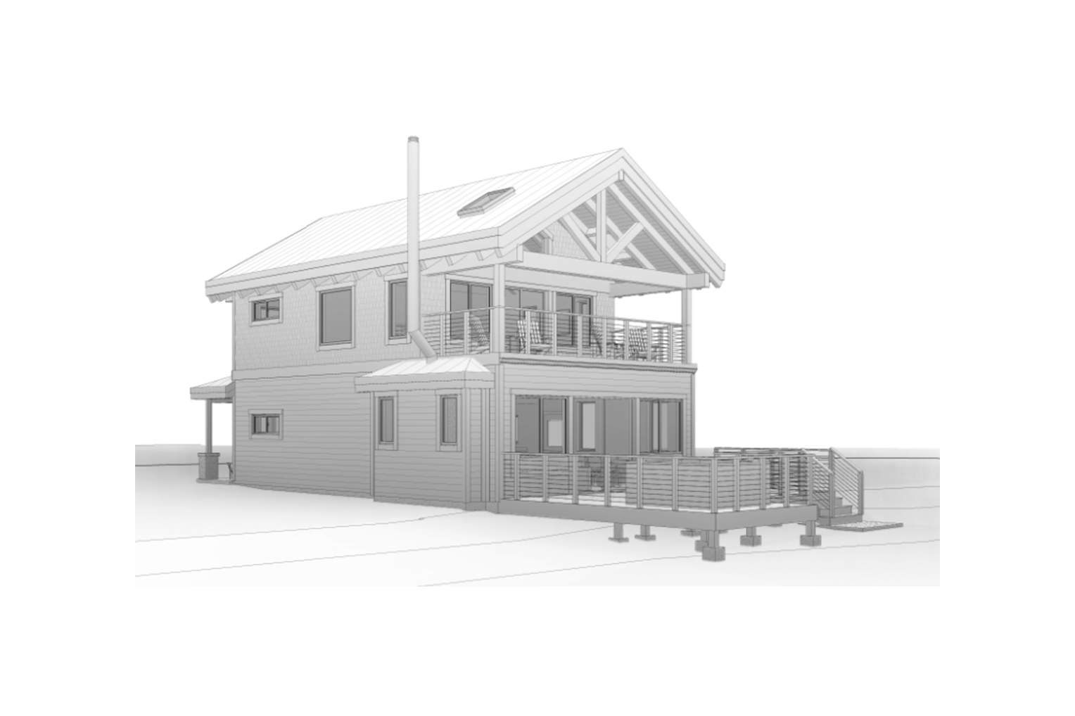 a cinematic photorealistic architectural render of a contemporary cedar wood cabin at golden hour warm amber sunlight grazing vertical cedar cladding and revealing natural grain knots and weathered texture minimalist cabin geometry with deep roof overhangs and large glazing forest edge setting with soft atmospheric depth subtle construction marks and light architectural annotations calm and intimate mood warm timber tones contrasted with shadow professional architectural presentation clean composition balancing realism and conceptual hand drawing