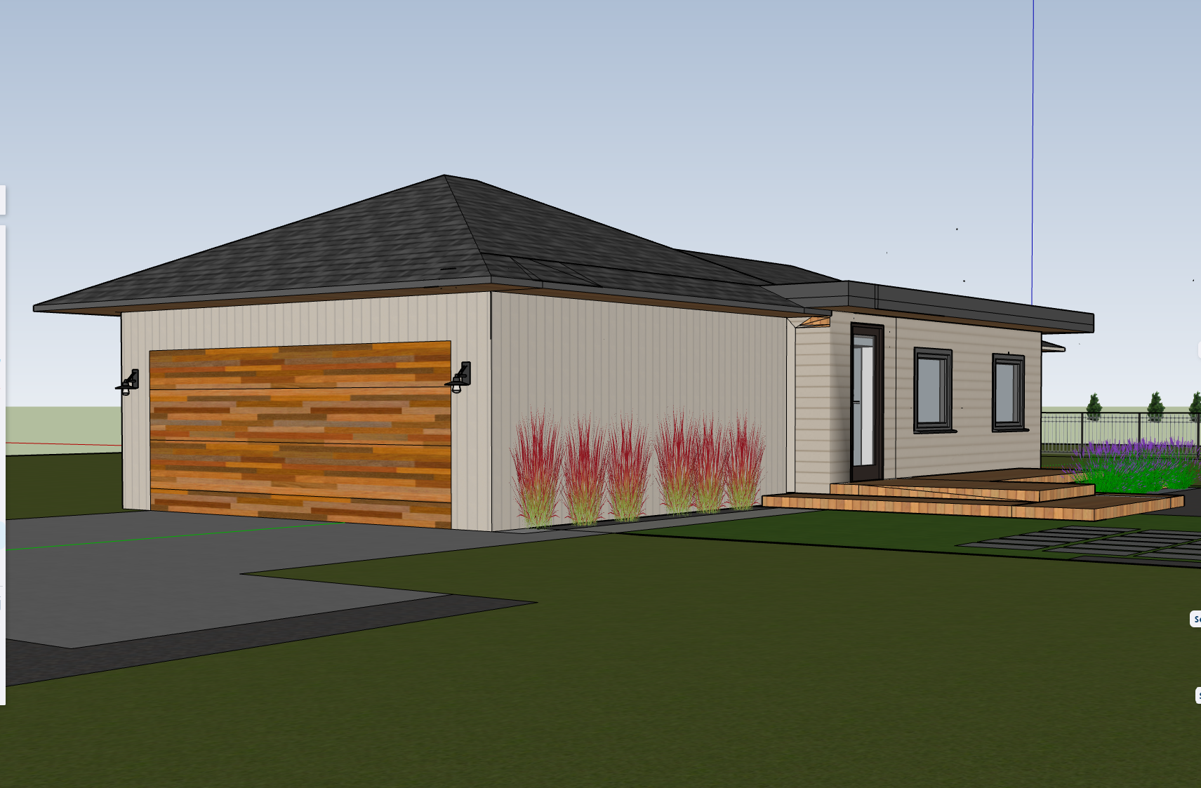 exterior shot render this contemporary concept with a contemporary minimalist look using beige minimalist siding use a warm wood soffit dark bronze gutters and downspouts change the vertical siding to all horizontal nickel gap