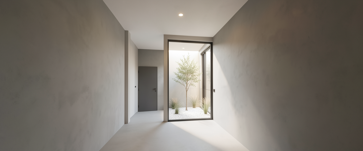 re render the provided scene in a bright scandinavian minimalist architectural style keep the exact perspective composition courtyard layout tree position door position and existing glazing unchanged use smooth off white to warm light grey plaster walls a light mineral floor soft natural daylight subtle warm indirect lighting and only very restrained light natural oak accents where appropriate add one clearly visible full height floor to ceiling window in the rear wall behind the tree the new window should clear glass and a frame integrated naturally into the scandinavian minimalist architecture the small wall projection on the left side in front of the door must not be wood and must not be any accent material it must be finished in exactly the same smooth light plaster and bright wall color as the surrounding wall so it blends in as much as possible and attracts as little attention as possible do not add furniture decoration people or any other architectural changes
