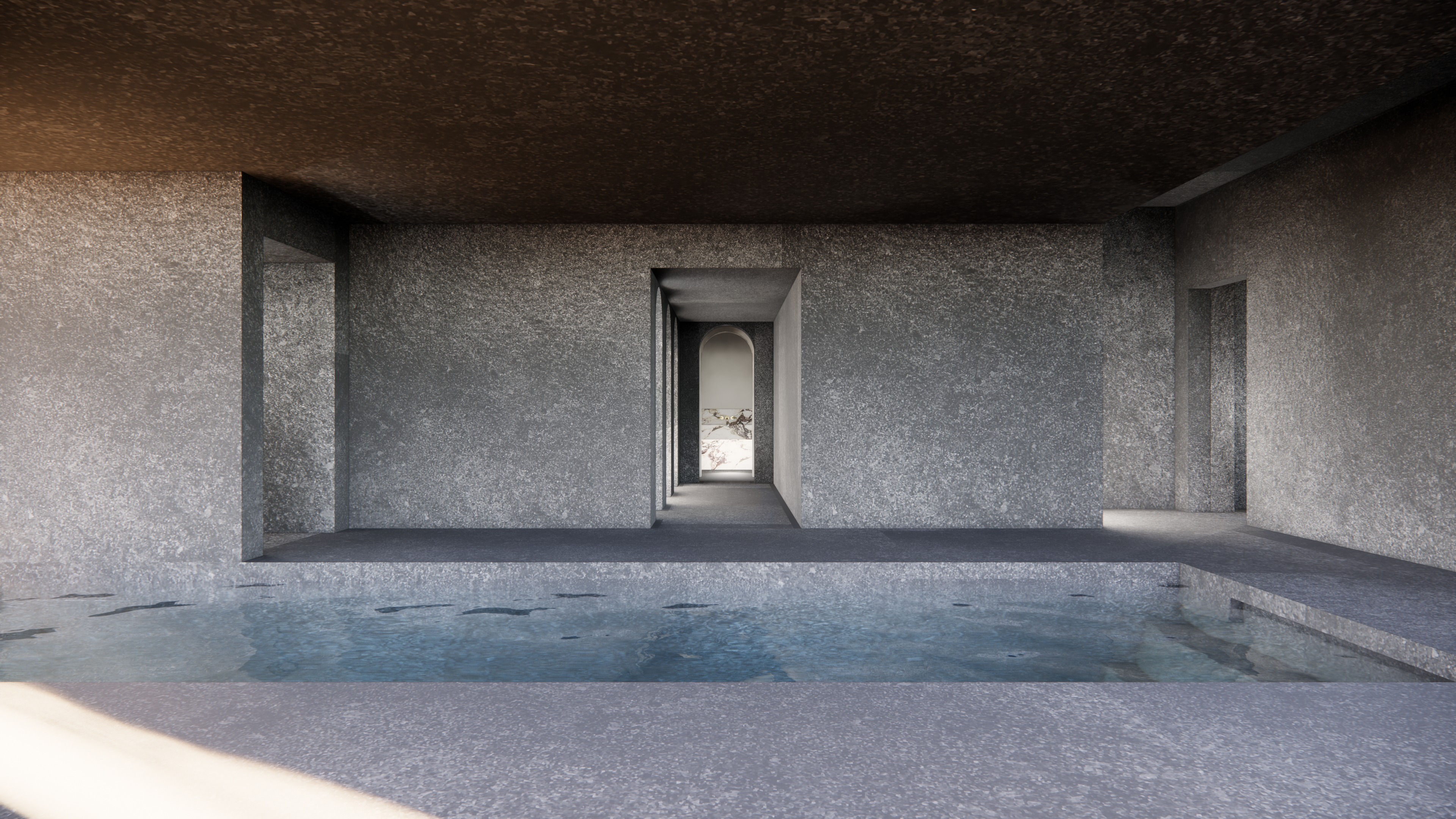 preserve exact architecture camera position proportions and openings apply consistent material palette across space use large format stone tiles on the floor with visible joints while walls and ceiling remain smooth and continuous in the same material tone and texture seamless finish no joints on vertical and overhead surfaces monolithic feel no high gloss reflections textural dark stone add irregular recessed pin lights to the ceiling deepen water to cool blue green tone increase reflectivity add subtle ripples and light mist above water match style of high end minimalist japanese wellness spa aman snohetta restrained atmospheric minimal do not add new elements do not change geometry do not distort proportions