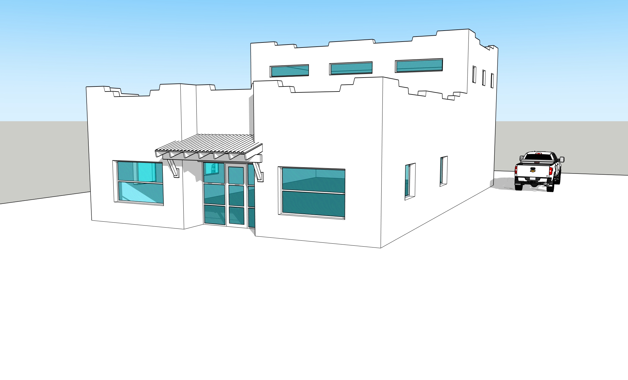 trim color at top of wall to match the stucco color door and window frames are black add some clouds to match a typical summer kansas afternoon add asphalt paving around the building change to a june evening at dusk and add wallpack down lights at the perimeter of building 12 above the paving