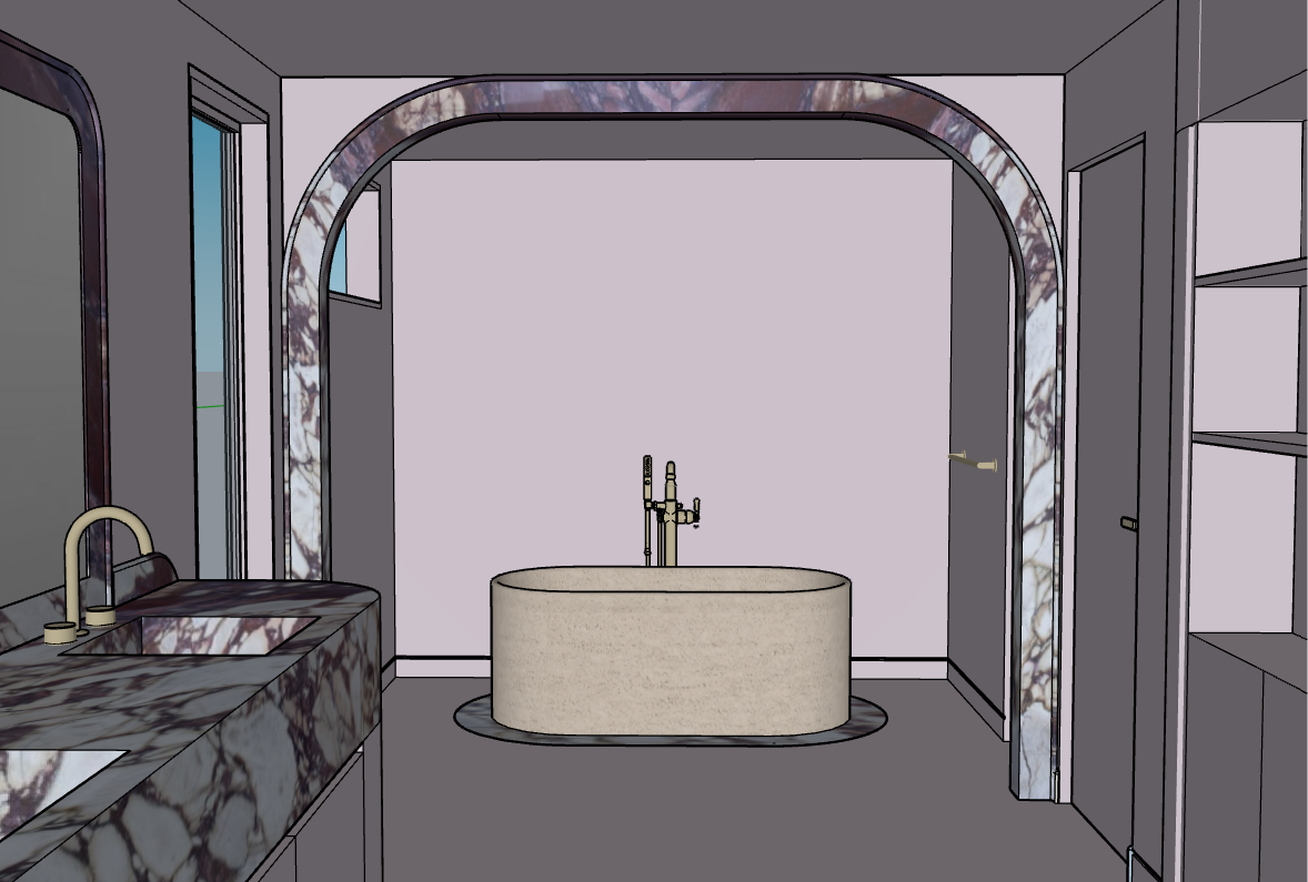 render the space in hyper realistic visualization quality at 8k resolution keep the vanity exactly as shown with all existing textures and materials unchanged the floors walls and ceiling should all use the same continuous toned down lilac limewash texture as in the reference image clearly showing a soft limewash painted finish rather than a flat color the mirror should have a gentle natural reflection so it reads clearly as a real mirror include one small recessed ceiling light positioned above the tub through the windows trees should be visible outside to create a natural exterior view the overall image should feel realistic calm and natural with accurate lighting and material texture