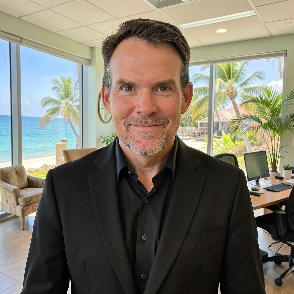 remove wrinkles change clothing to black button down shirt background interior of an aesthetic effect llc architecture office on st john usvi office is to be non commercial in decoration setting to be more beach like person s body is larger and more muscular