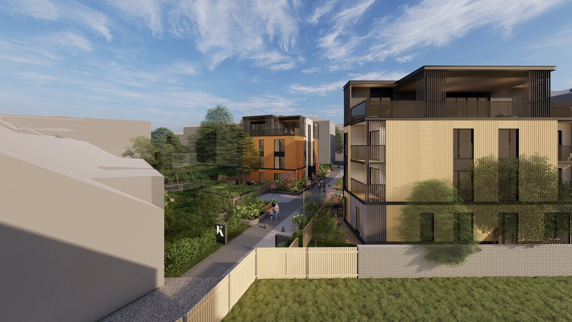 photorealistic architectural photograph captured at 2 pm on a cloudy day sunlight beams from the right side soft lighting keep the massing and facade materials layout keep the original facade material placement and color palette keep the saturation of the orange and yellow colors the vegetation is nordic garden style keep the amount and massing of the vegetation dont add extra vegetation