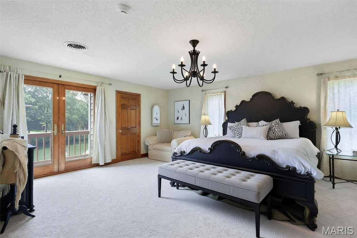 update the furniture and decor to be modern warm and inviting replace the chest at the end of the bed with an neutral upholstered bench replace the ceiling fan with a black rustic chandelier remove items from left corner remove chair from corner