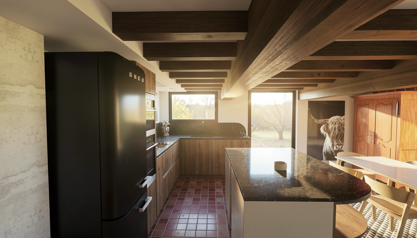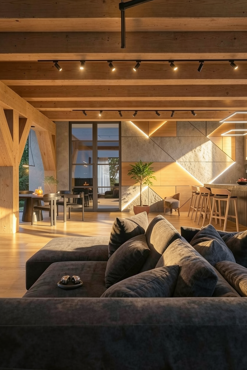 ultra realistic interior rendering of a modern living kitchen indirect warm white lighting integrated along the sides of a suspended ceiling combined with warm white ceiling spotlights creating a soft ambient glow additional indirect warm white led lighting beneath a wooden sideboard on the right side on the right wall a sleek grey glass backsplash adds a subtle reflective surface above the kitchen island a sculptural curved pendant lamp provides focused direct lighting and acts as a design centerpiece in the background on the right a cozy beige corduroy sofa enhances the warm atmosphere soft jade green silk curtains hang elegantly adding a refined color accent natural materials balanced lighting soft shadows high detail realistic textures global illumination physically accurate materials cinematic composition ultra photorealistic 8k